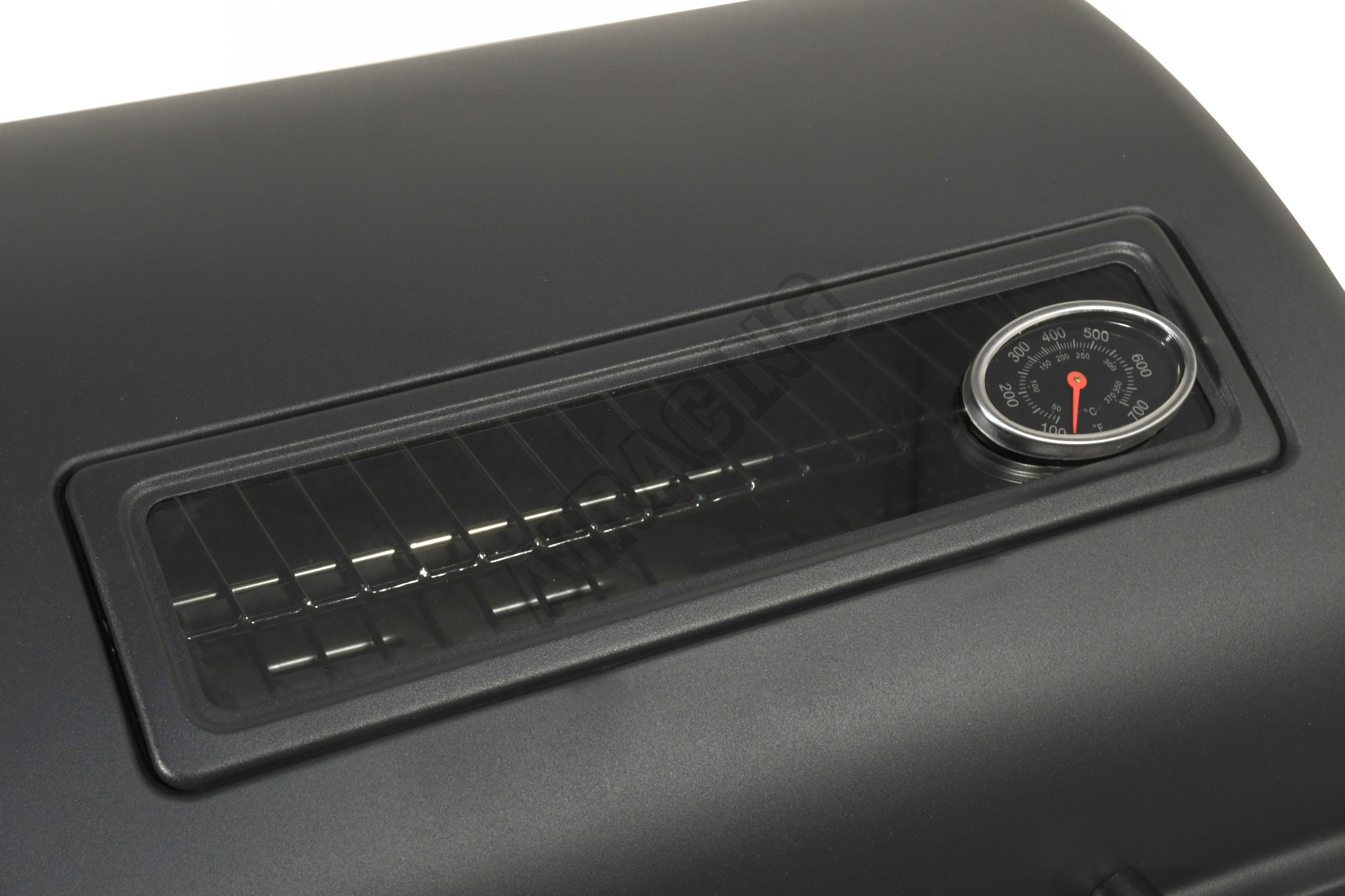 Sklopné víko grilu je opatřeno průzorem, díky kterému je možné sledovat stav grilovaných pokrmů bez otevírání grilu. Gril je pojízdný (2 kolečka), je dále vybaven odkládacími poličkami na obou stranách. Součástí je i spojovací hadice k plynové lahvi a redukční ventil.