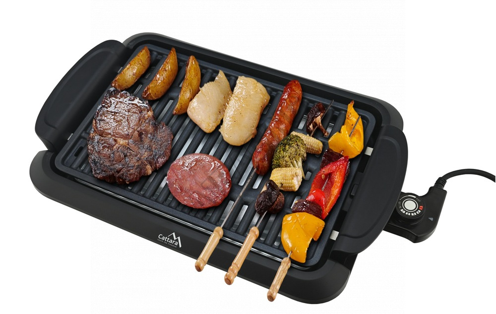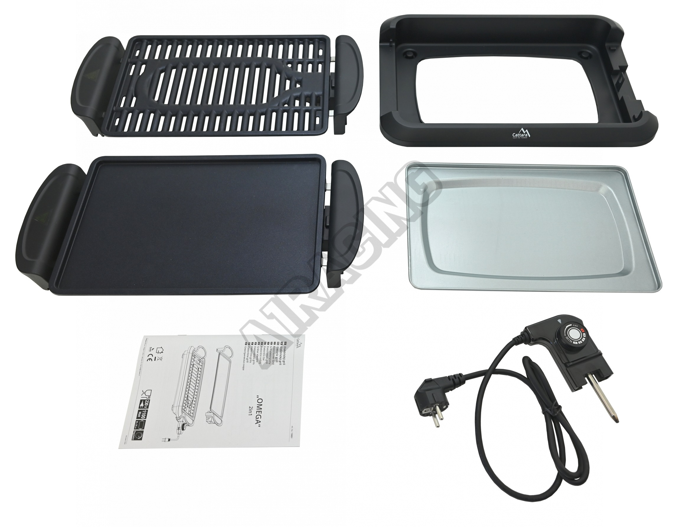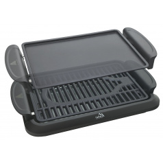 Elektrický stolní gril OMEGA 2v1 s vyměnitelnými rošty a příkonem 900-1100W.