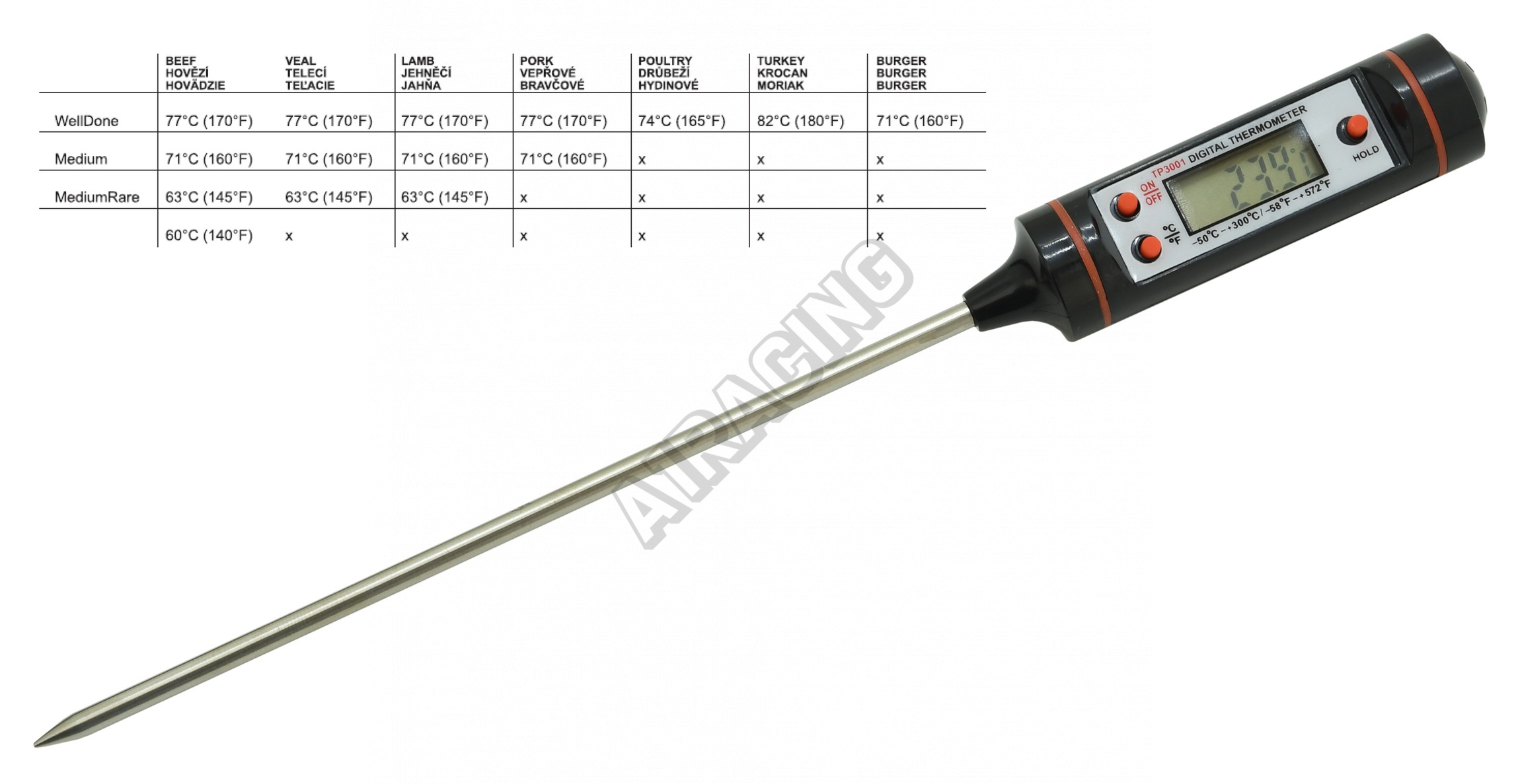 Mimojiné je součástí sady i injekce pro aplikaci marinády do masa a praktický teploměr s nerezovou sondou pro ověření provedení masa s rozsahem měření -50 - 300°C. O napájení teploměru se stará 1x baterie LR44 (1,5V).