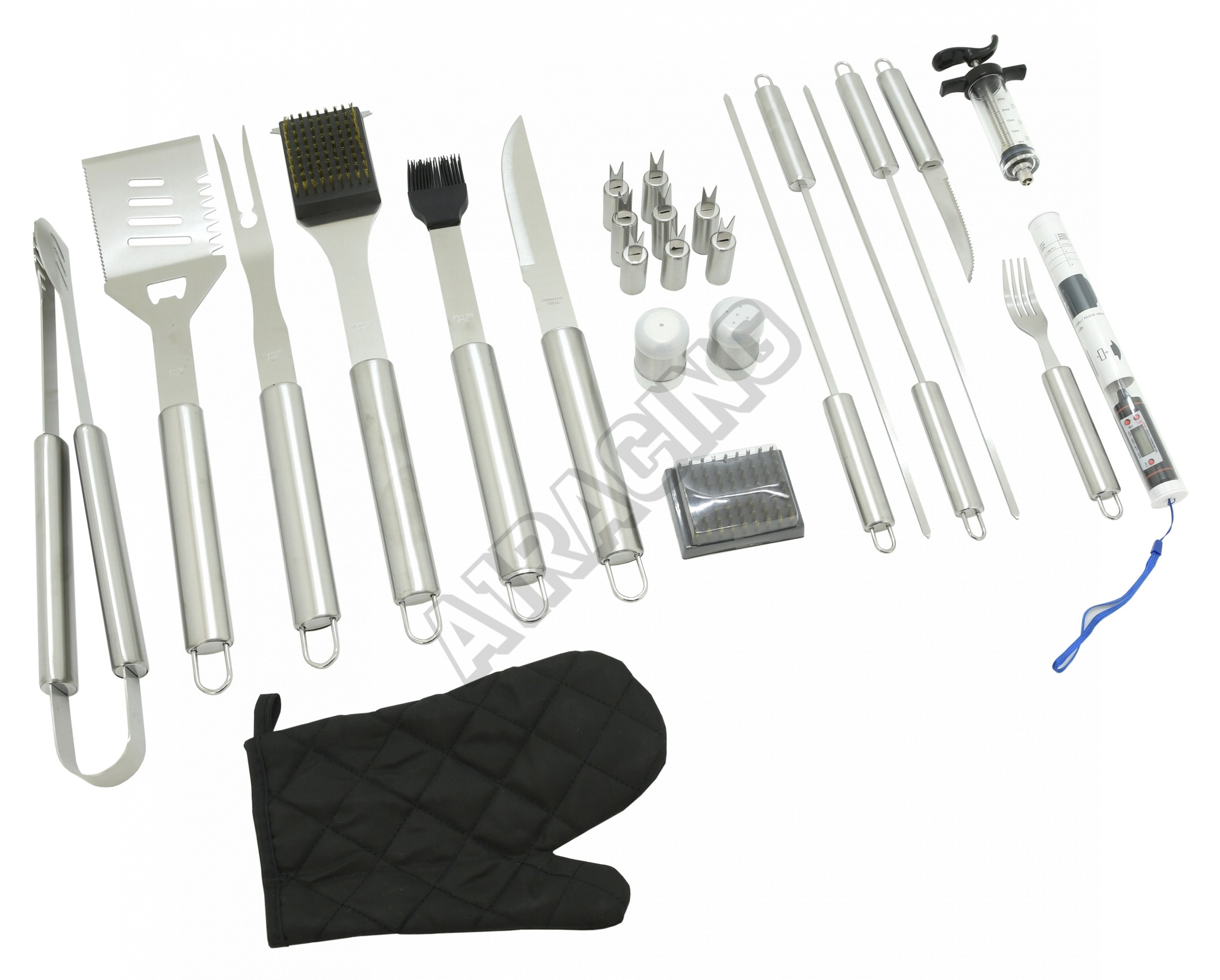 Sada obsahuje veškeré nástroje pro přípravu a konzumaci nejrůznějších pokrmů, ale i následnou údržbu grilu. Veškeré nástroje jsou navíc kvalitně zpracovány z nerezové oceli.
