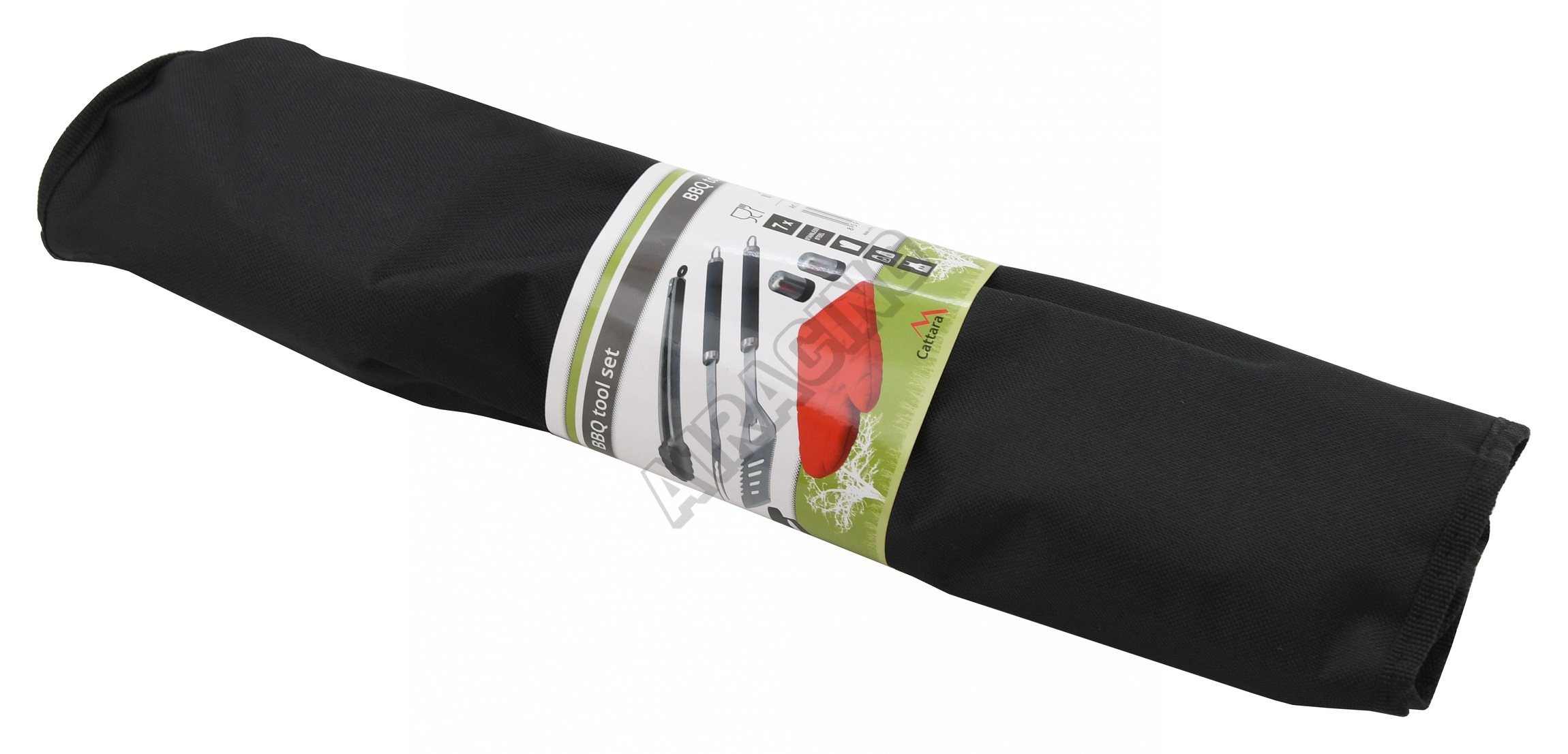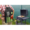 Sada nářadí a zástěry pro grilování, skládající se ze zástěry opatřené kapsami a slánkou, s pepřenkou, rukavicí a klasickými nástroji jako obracečka, vidlička a kleště.