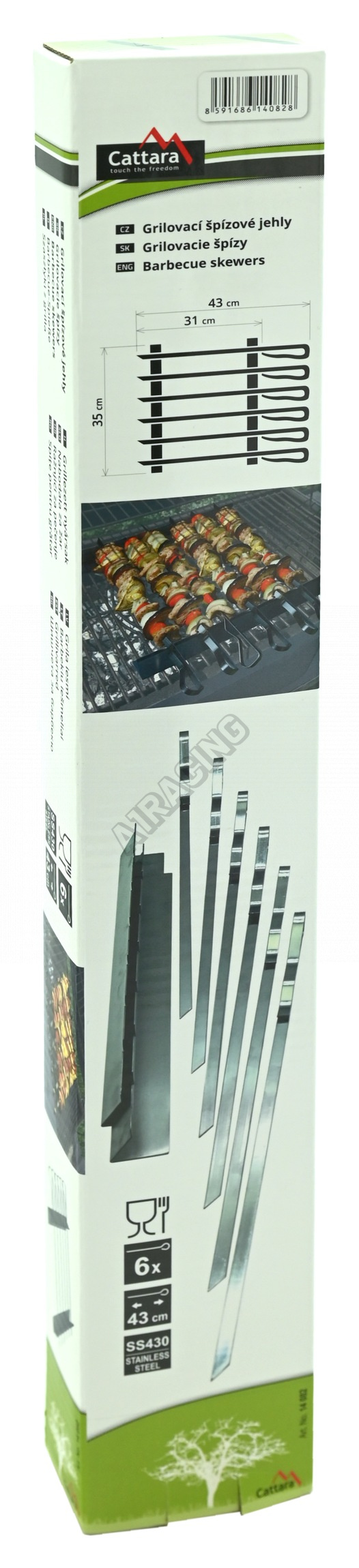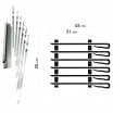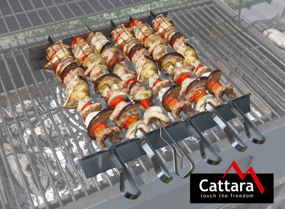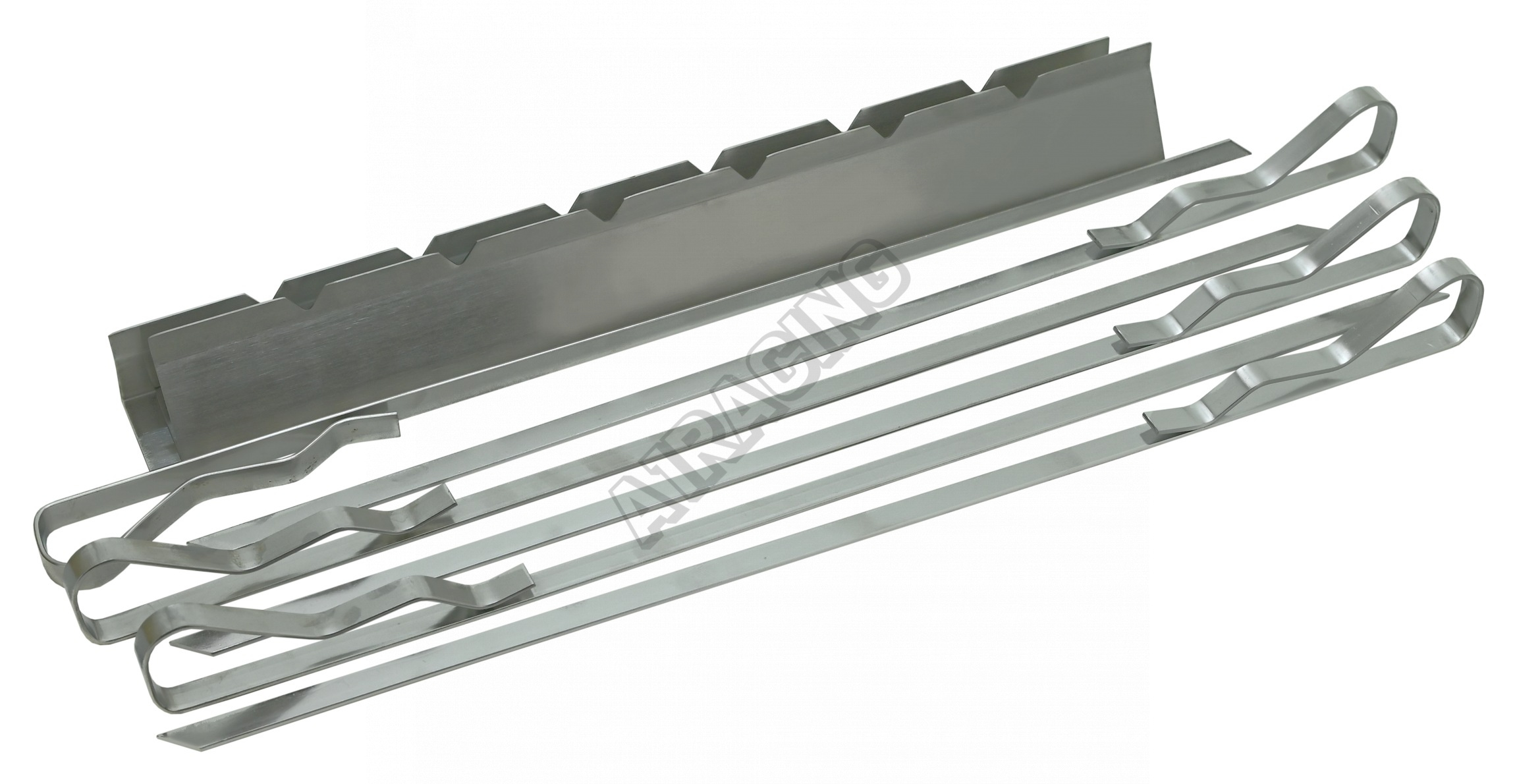 Sada obsahuje 6x jehel s délkou 43 cm a sílou plechu 1,9 mm. Jehly jsou dostatečně odolné pro velké porce potravin, osadit lze až 31 cm délky každé jehly. Díky širokému (1 cm) profilu jehel se suroviny na špízu svévolně neprotáčí. Zakončení je opatřeno profilovanou rukojetí, která usnadní manipulaci a otáčení jehel na podstavci.