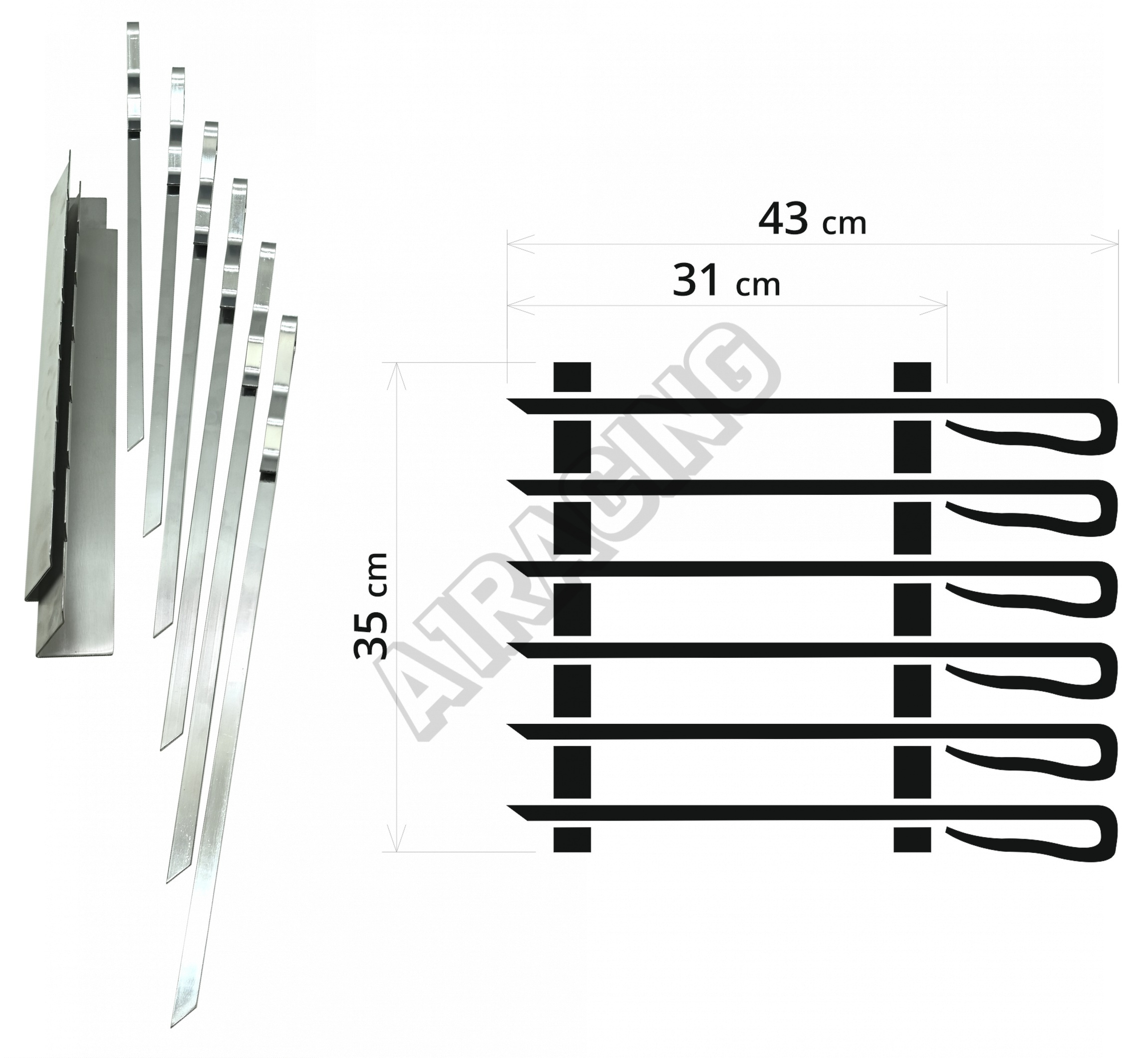 Podstavec je dvoudílný s délkou 35 cm a sílou plechu 1,2 mm. Oba díly lze umístit podle velikosti špízů, což zajišťuje maximální flexibilitu při grilování. Podstavce umožňují umístit špízy do drážek ve výšce 3 cm, takže se rovnoměrně propečou ze všech stran. Drážky navíc usnadní otáčení.