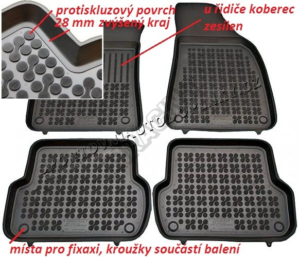 zvýšený okraj 28mm pro bezpečné zadržení nečistot, vyrobeny ve velmi vysoké kvalitě z měkké a trvanlivé pryže v černém provedení bez zápachu, jsou přesně tvarovány na konkrétní typ vozidla, součástí balení jsou fixace na přední pár koberců, nejvytíženější část je zesílena