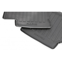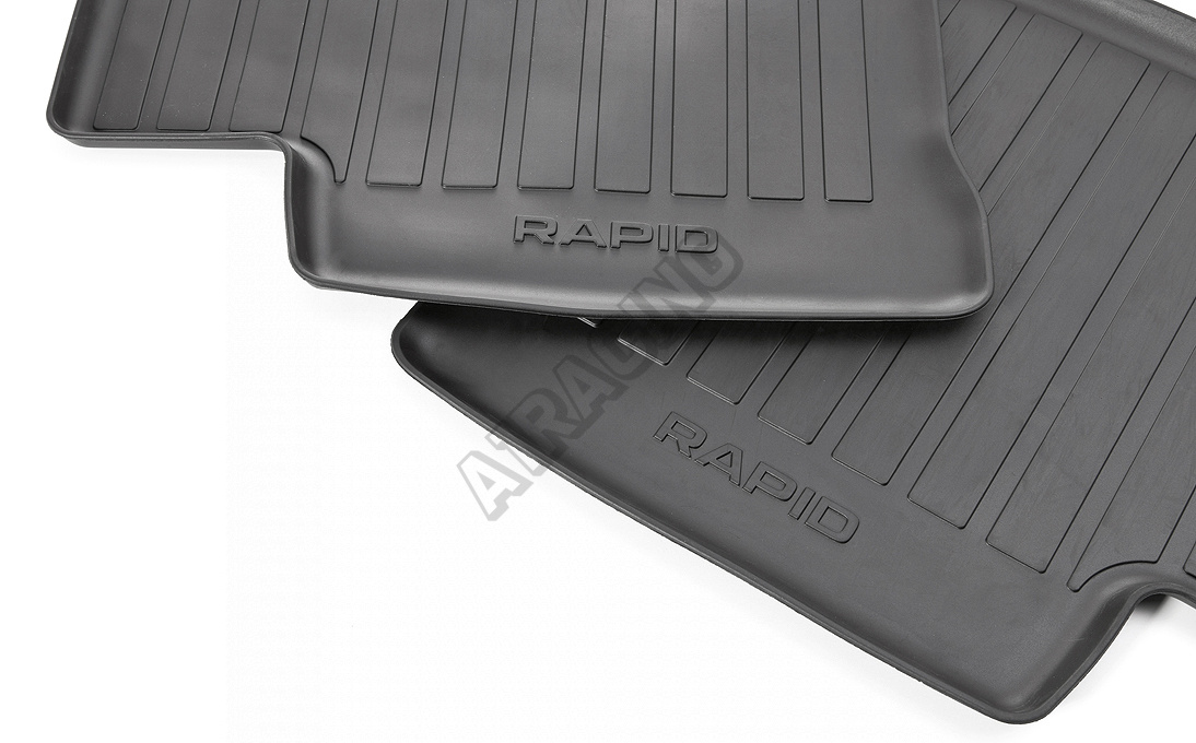 Originální gumové koberce se zvýšeným okrajem, přesně tvarované, snadno omyvatelné. Nápis Rapid.