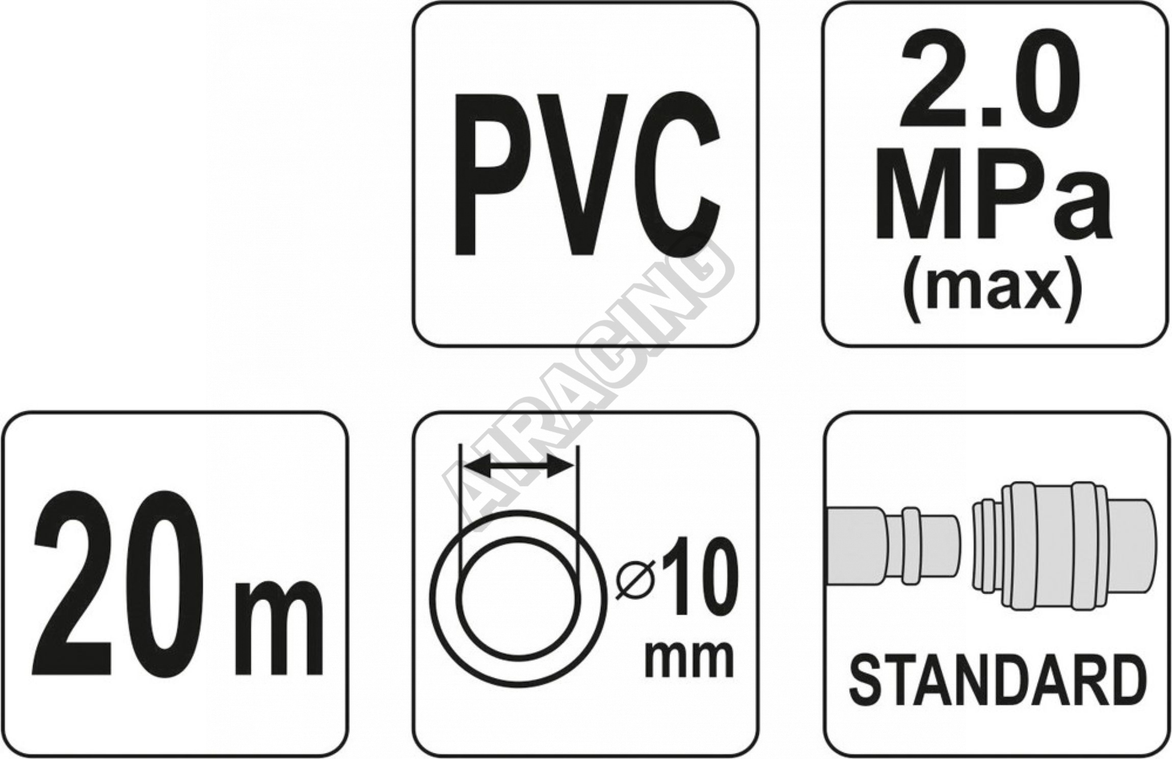 Profesionální vzduchová hadice s délkou 20 m zakončená rychlospojkami. Hadice je zhotovená z PVC odo
