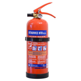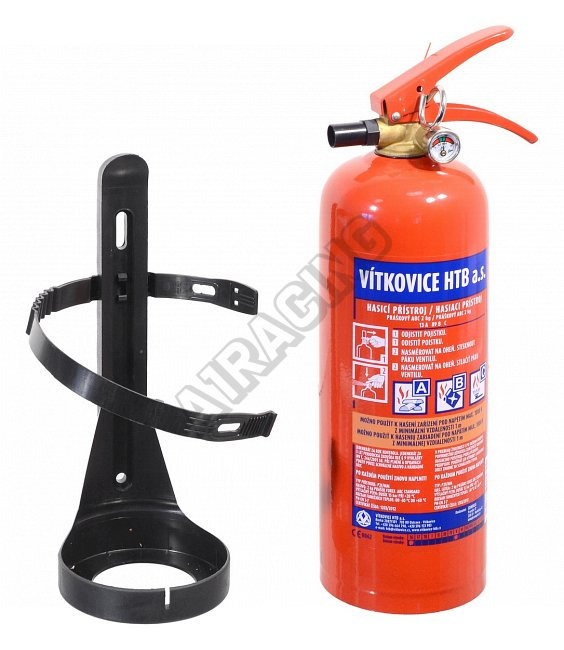 Práškový hasicí přístroj s hasící schopností (13A 89 B/C) a s držákem, díky kterému je snadné jej připevnit na zeď či do automobilu.