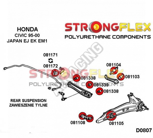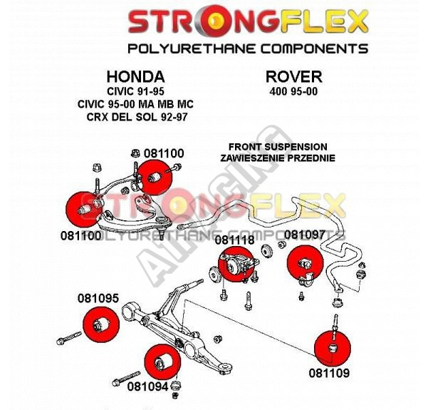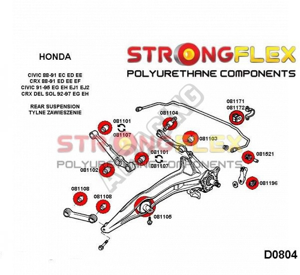 Honda Civic 1992-95 StrongFlex (tvrdost 80ShA) kompletní sestava silentbloků na celé auto obsahuje :