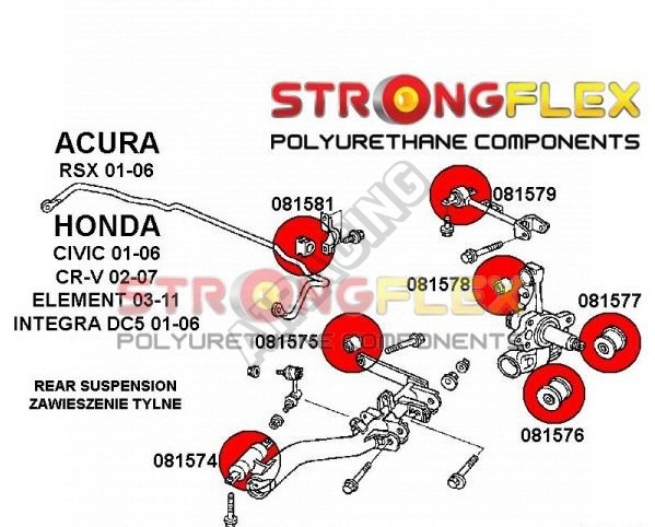 Honda CRV StrongFlex (tvrdost 80ShA) kompletní sestava silentbloků na celé auto obsahuje :