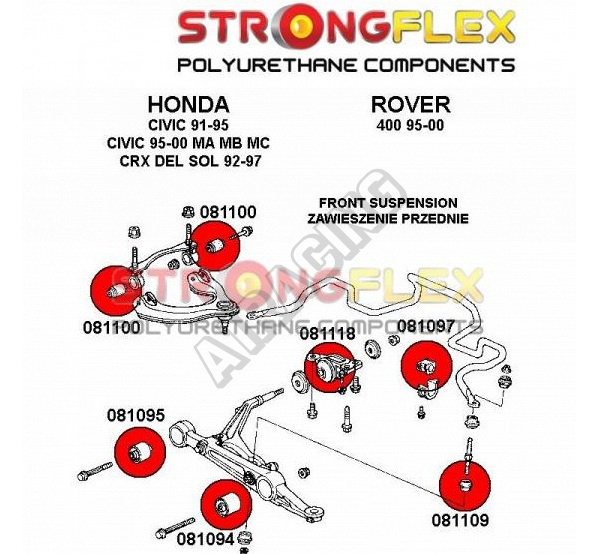 Honda CRX StrongFlex Sport (tvrdost 90ShA) kompletní sestava silentbloků na celé auto obsahuje :