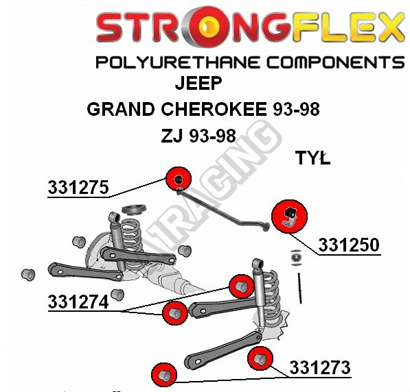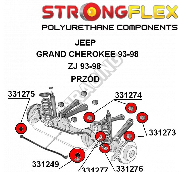 Jeep Grand Cherokee 1993-98 StrongFlex (tvrdost 80ShA) kompletní sestava silentbloků na celé auto obsahuje :