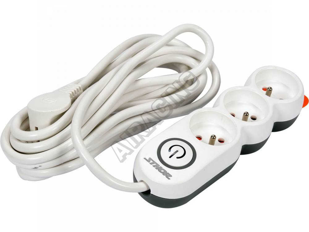 Prodlužuvací kabel, který má uzemněné zásuvky a vypínač od značky Sthor.