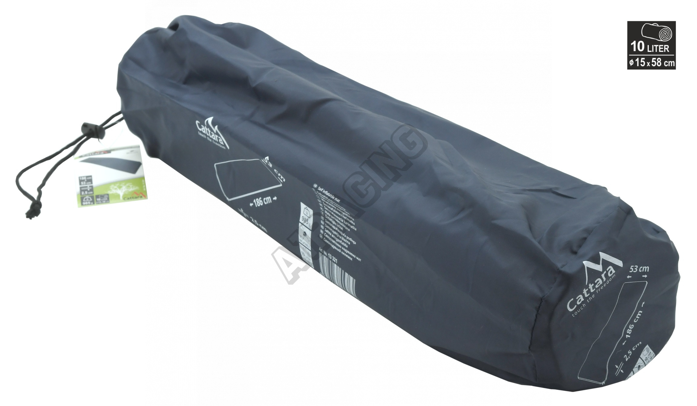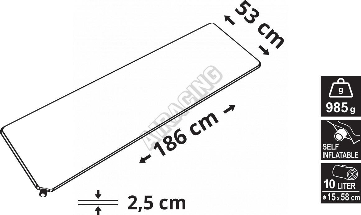 Barva karimatky je modrá, rozměry jsou 186 x 53 cm a tlouštka 2,5 cm. Balení má drobné rozměry 58 x 15 cm a váhu 985 g, takže není problém mít ho jako zavazadlo v přírodě vždy s sebou.