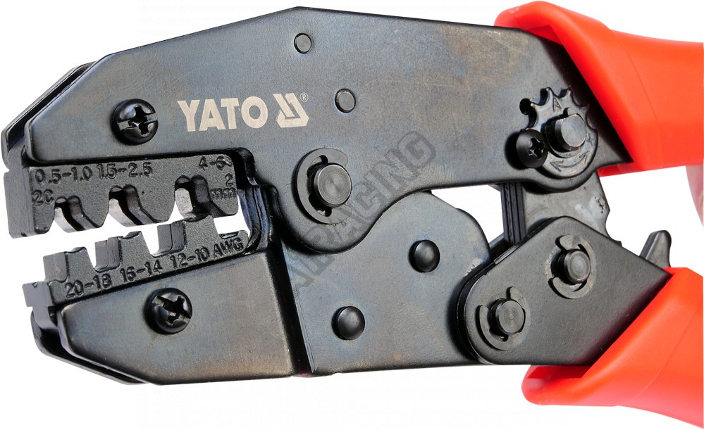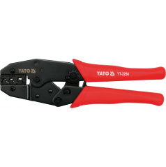 Kleště YT-2250 pro krimpování izolovaných konektorů, se zčernalým povrchem, který chrání před korozí, a s plastovými kryty rukojetí. Rohatkový mechanismus umožňuje rychlé a přesné upnutí bez použití nadměrné síly.
