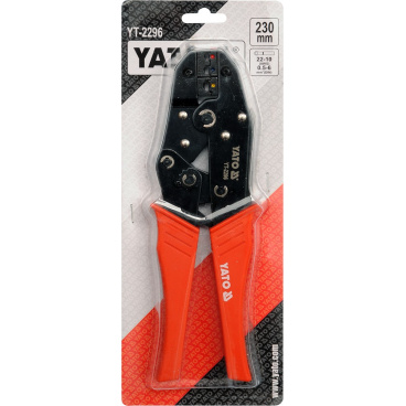 Kleště YT-2296 pro krimpování izolovaných konektorů, se zčernalým povrchem, který chrání před korozí, a s plastovými kryty rukojetí. Rohatkový mechanismus umožňuje rychlé a přesné upnutí bez použití nadměrné síly.