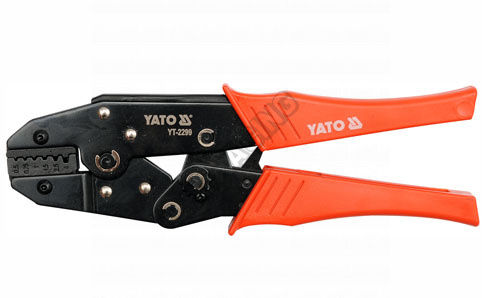 Kleště YT-2299 pro krimpování izolovaných konektorů, se zčernalým povrchem, který chrání před korozí, a s plastovými kryty rukojetí. Rohatkový mechanismus umožňuje rychlé a přesné upnutí bez použití nadměrné síly.