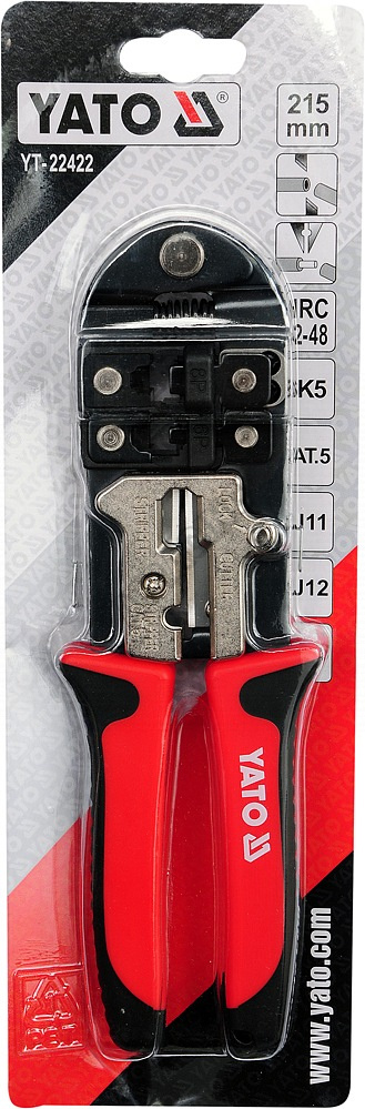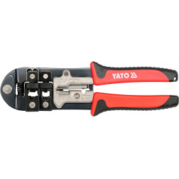 Kleště YT-22422 pro krimpování telefonních a síťových terminálů, zčernalý povrch, který chrání před korozí a dvousložkovými plastovými rukojeťmi.