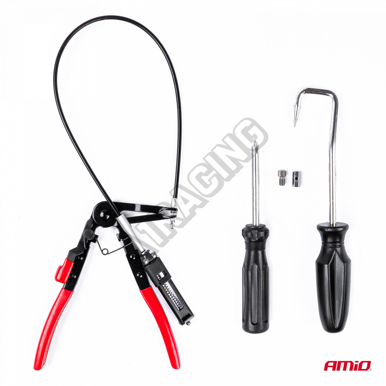 Sada kleští na svorky, která zaručuje pohodlí při práci v autoservisu nebo domácí dílně. Všechny prvky jsou vyrobeny z vysoce kvalitních materiálů. Kleště s otočnými čelistmi se hodí pro většinu typů pružných svorek, otočné čelisti jsou vroubkované pro dobré držení velkých i malých svorek pod jakýmkoli úhlem. Západková blokáda umožňující udržení čelistí v 5 různých polohách. Blokáda umožňuje bezpečné držení napnutého pásku.