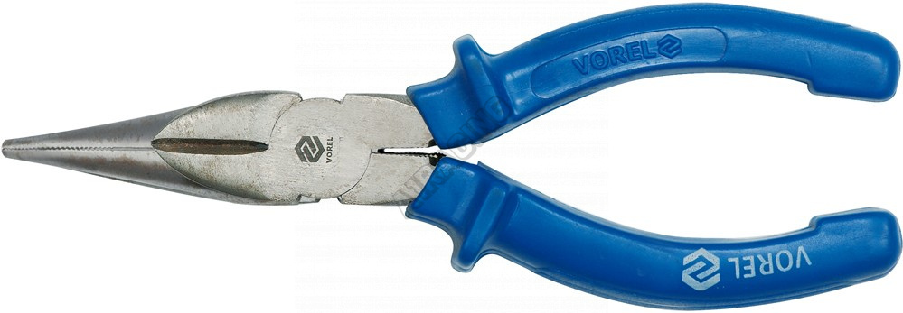 Prodloužené rovné kleště 200 mm. Povrch zoubkovaných čelistí s profilovanými břity pro střihání drátu a hřebíků. Rukojeti potažené pohodlnými plastovými kryty.