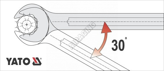 Očkoplochý klíč Yato vyrobený z chromvanadiové slitiny oceli, povrch je částečně satinovaný a leštěný do vysokého lesku. AS-Drive je vylepšený profil u nástrčných a očkových klíčů, v tomto případě očka.