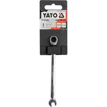 Ráčnový očkoplochý klíč Yato - na jedné straně klasický stranový klíč, na straně druhé očkový klíč s dvanáctihranným profilem vybaveným ráčnou s jemným dělením 72 zubů. Tělo klíče je vyrobeno z chromvanadiové oceli CrV6140. Povrch je vyleštěn do vysokého lesku.