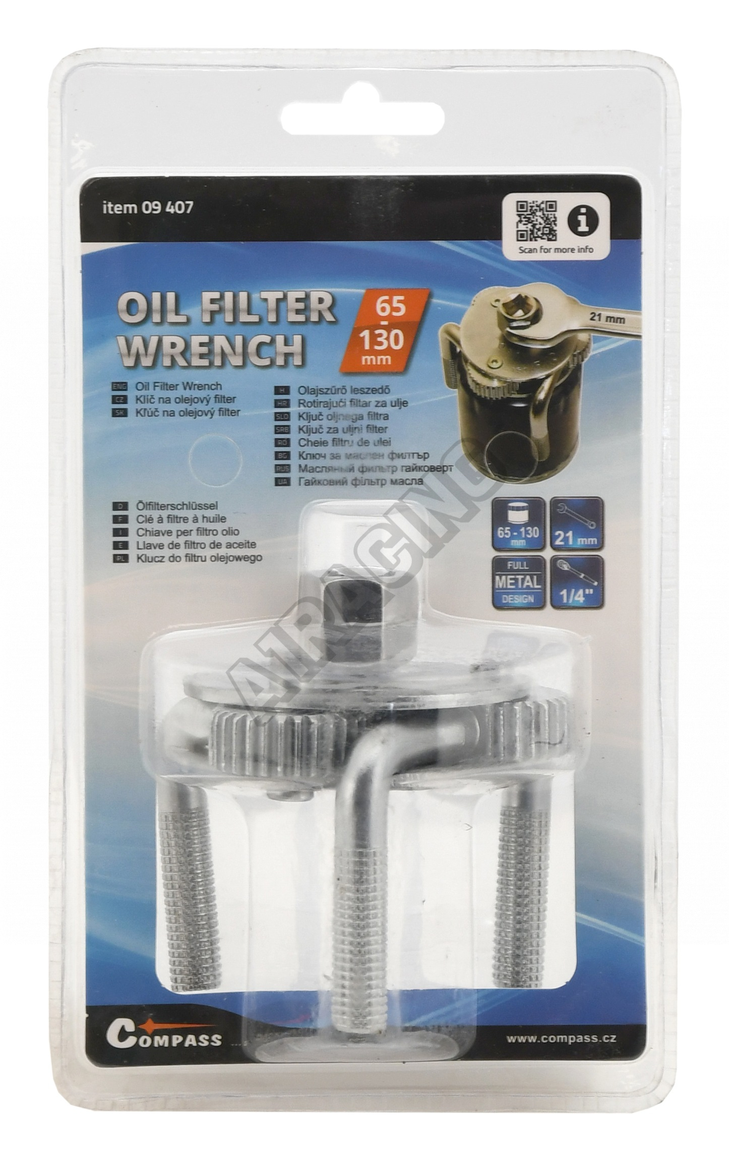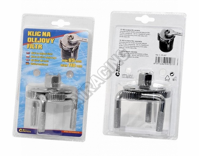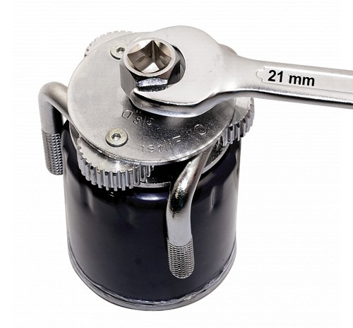 Univerzální klíč pro montáž a demontáž olejových filtrů. Pro filtry o průměru 65 - 125 mm. Vhodný i pro auta se zúženou pracovní oblastí. Celokovová konstrukce, povrchová úprava, zdrsnění (zuby) na upínacích ramenech pro pevný záběr při uvolňování nebo utahování olejového filtru. Klíč se nasadí na olejový filtr a pomocí ráčny (1/2") nebo stranového či nástrčného klíče (21mm) se olejový filtr utáhne či povolí.