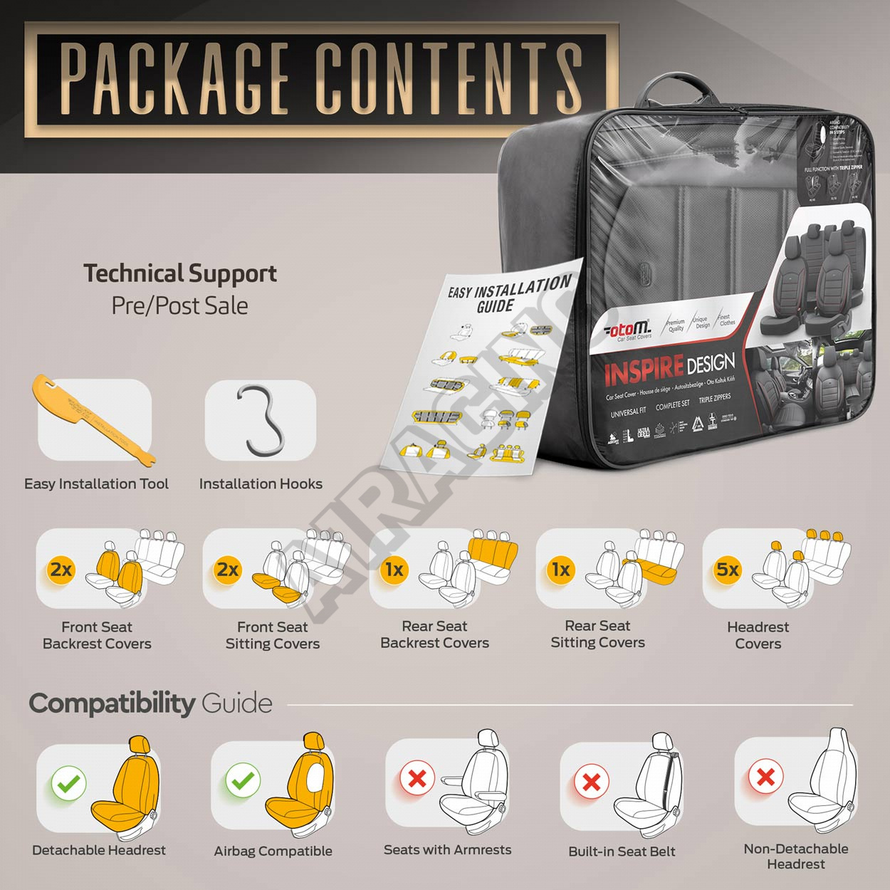 Potahy mají zipy na zadní lavici, díky čemuž pasují na většinu sedadel dostupných na trhu, (lavic nedělených, dělených pravostranně i levostranně).