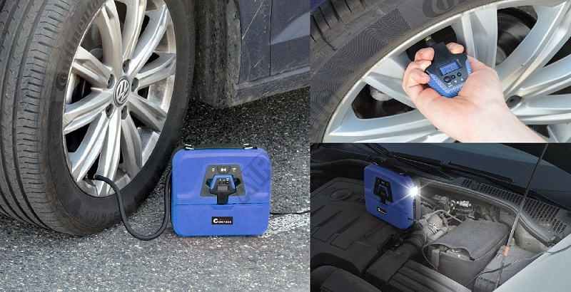 Vestavěný odnímatelný pneuměřič, zobrazuje naměřený tlak v několika různých jednotkách. Vestavěná svítilna 9x LED pro osvětlení pracovního prostoru. Před použitím důkladně pročtěte přiložený návod.