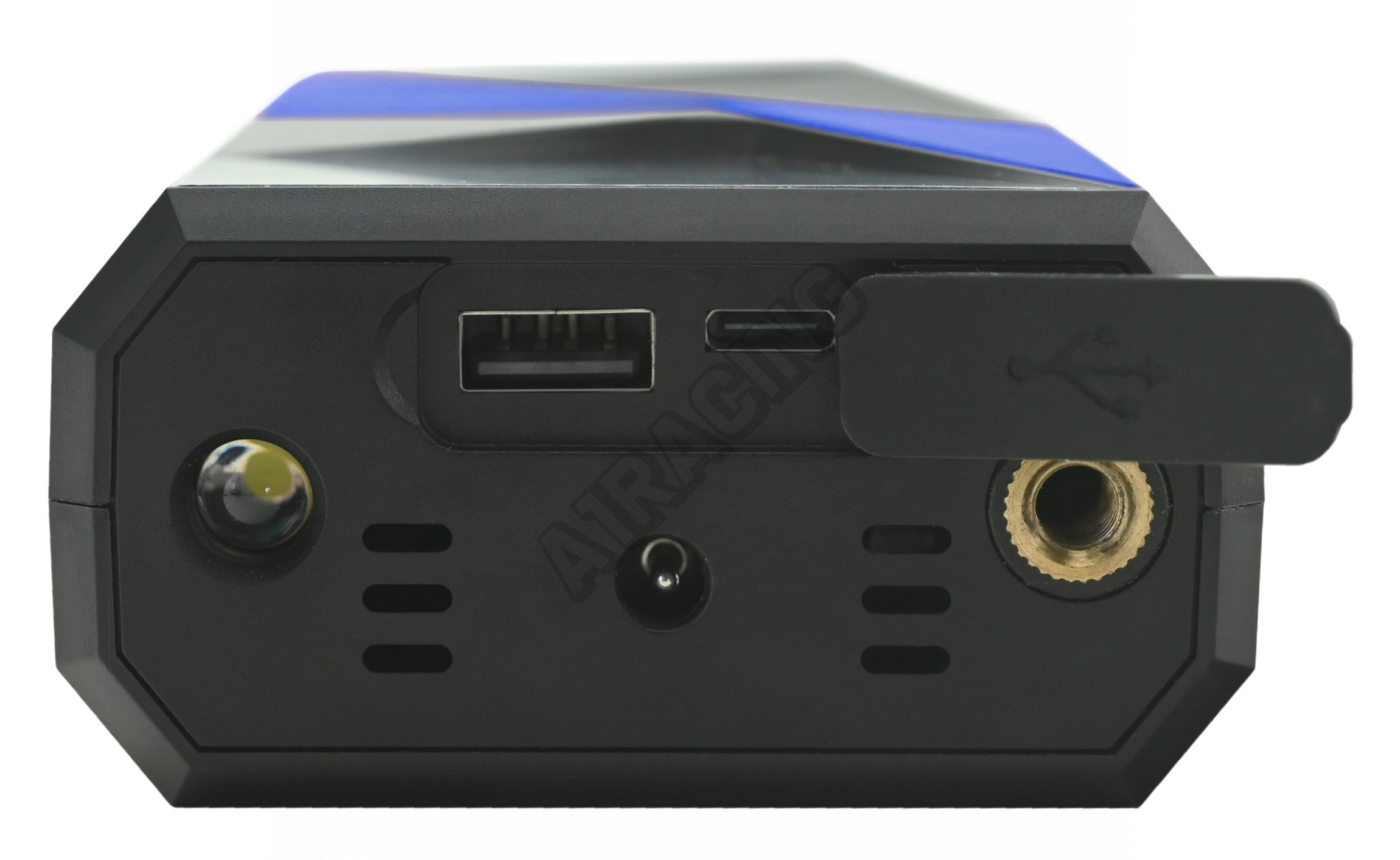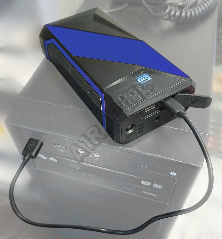 Nabíjení 2000mAh akumulátoru kompresoru je řešeno pomocí USB-C kabelu. Stav akumulátoru je zobrazen na displeji. Pro nouzové použití (při vybití akumulátoru) je možné kompresor napájet pomocí 12V konektoru.
