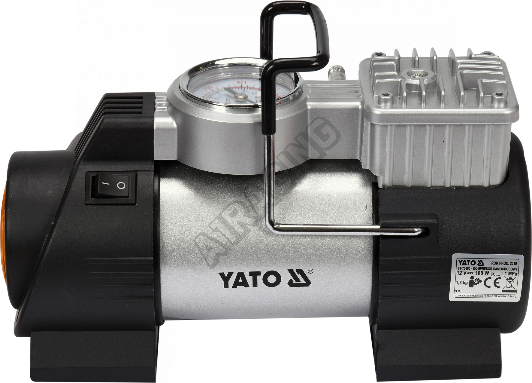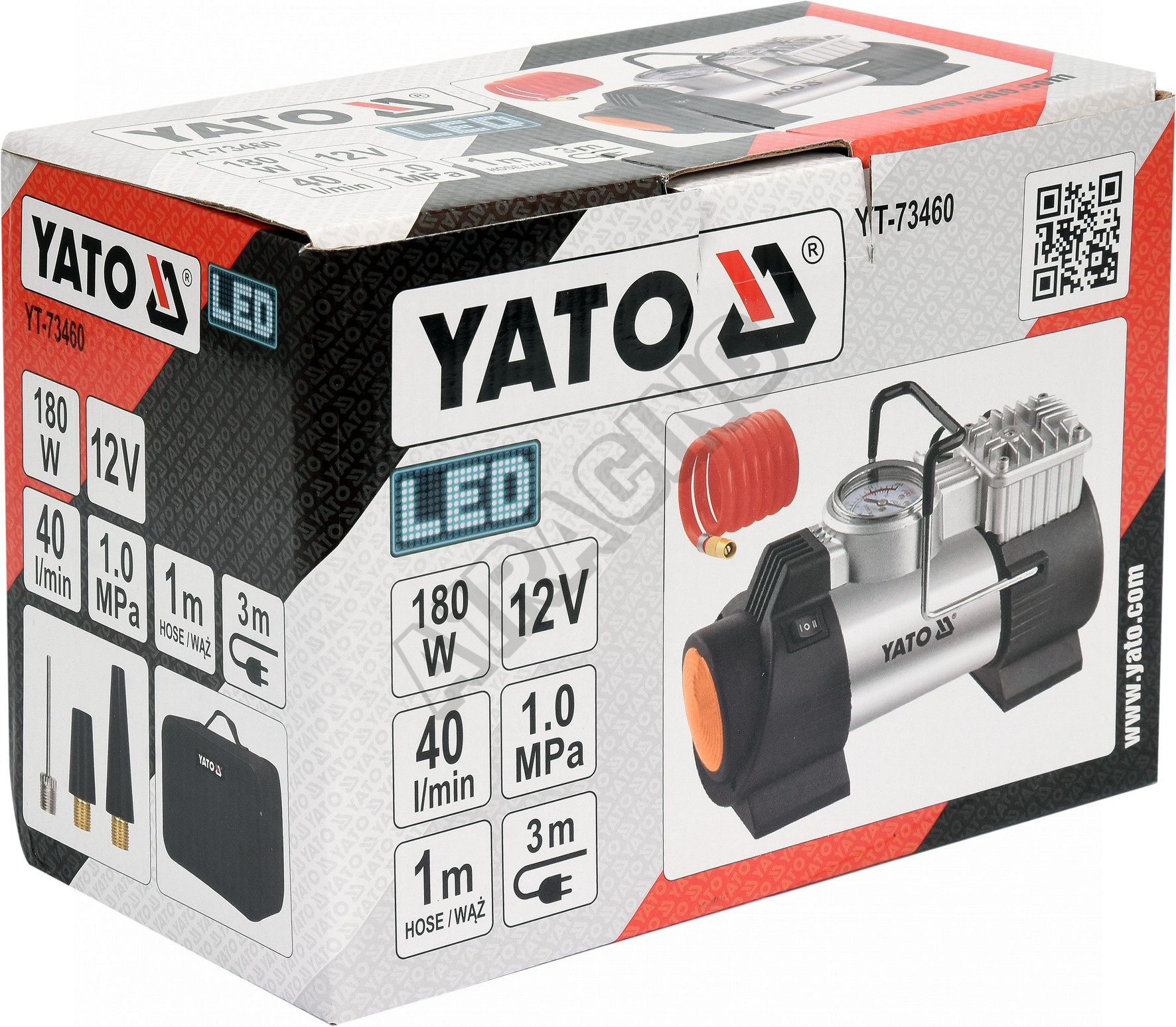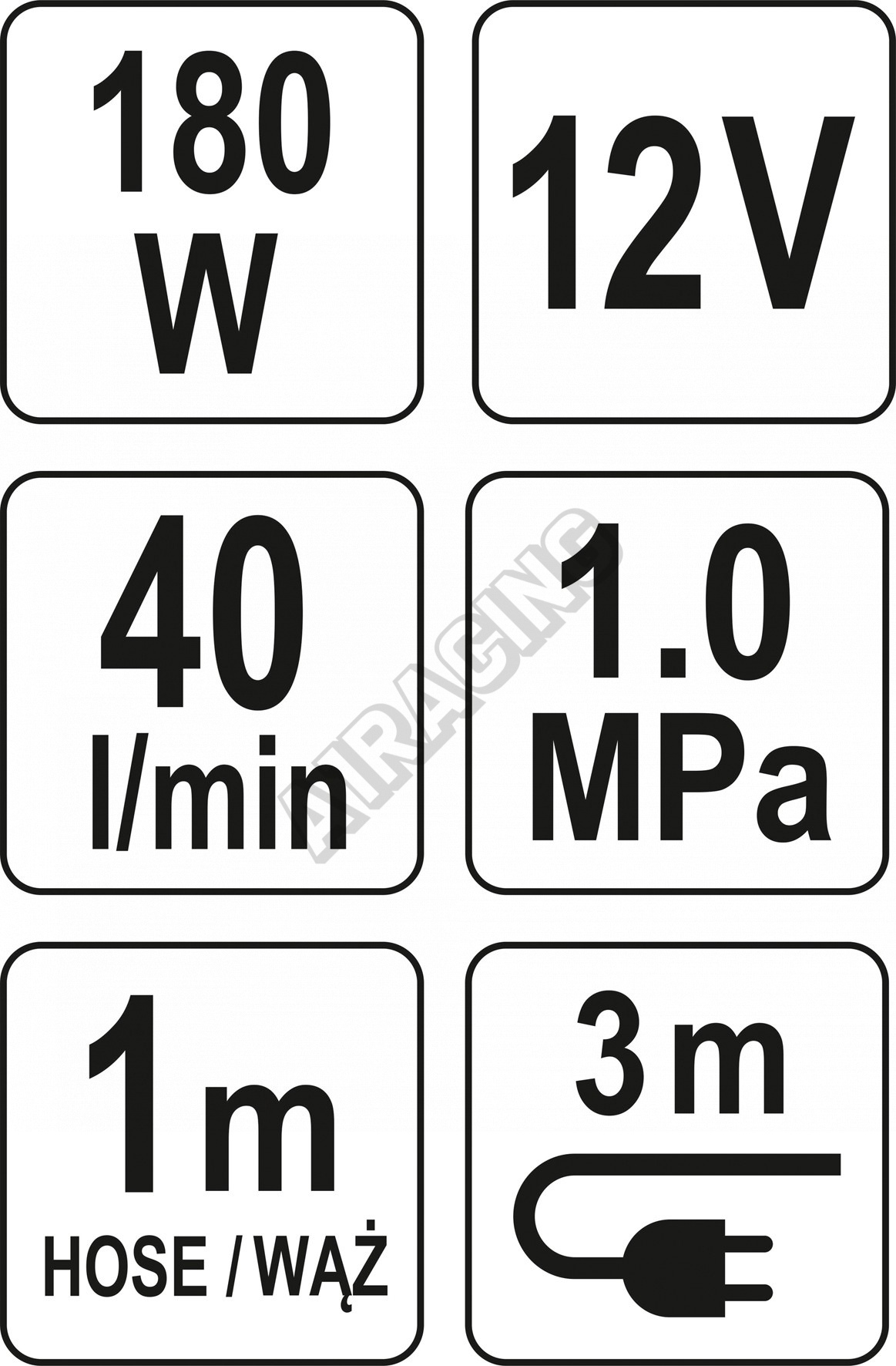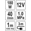 Technická data Výkon 180W Max. tlak 150 PSI (10 bar - 1 Mpa) Průtok vzduchu 40 l/m Délka kabelu 3m Napájení 12 V Výměnné trysky 3 x Svítilna LED Prodlužovací hadice 1m