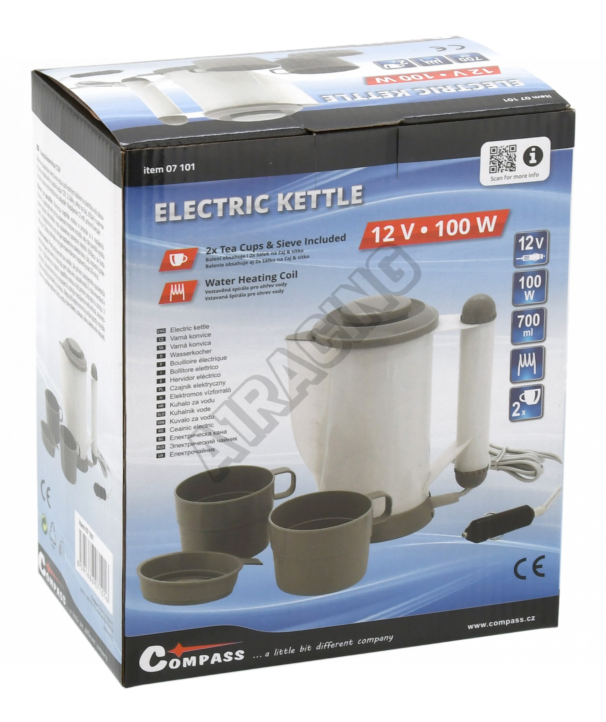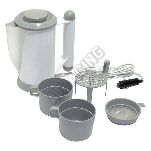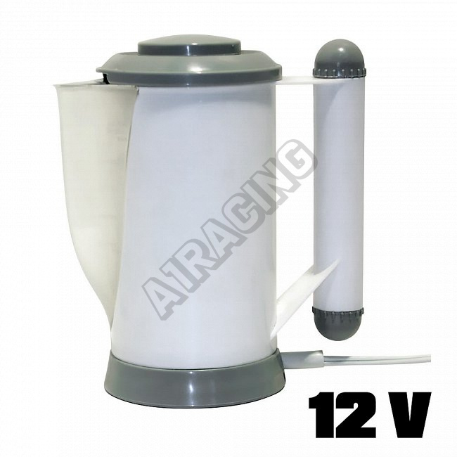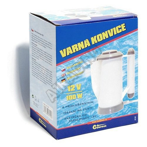 Varná konvice, napájení 12V, zástrčka do zásuvky automobilového zapalovače. Objem konvice 700ml. Balení obsahuje varnou konvici s přívodním kabelem, 2 šálky, sítko na čaj, držák k upevnění konvice a vymezovací adaptér. Napájení 12 volt, příkon 8 ampér.