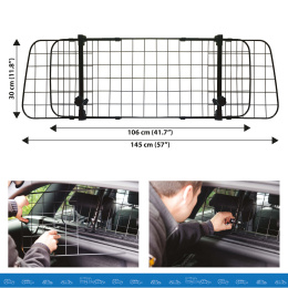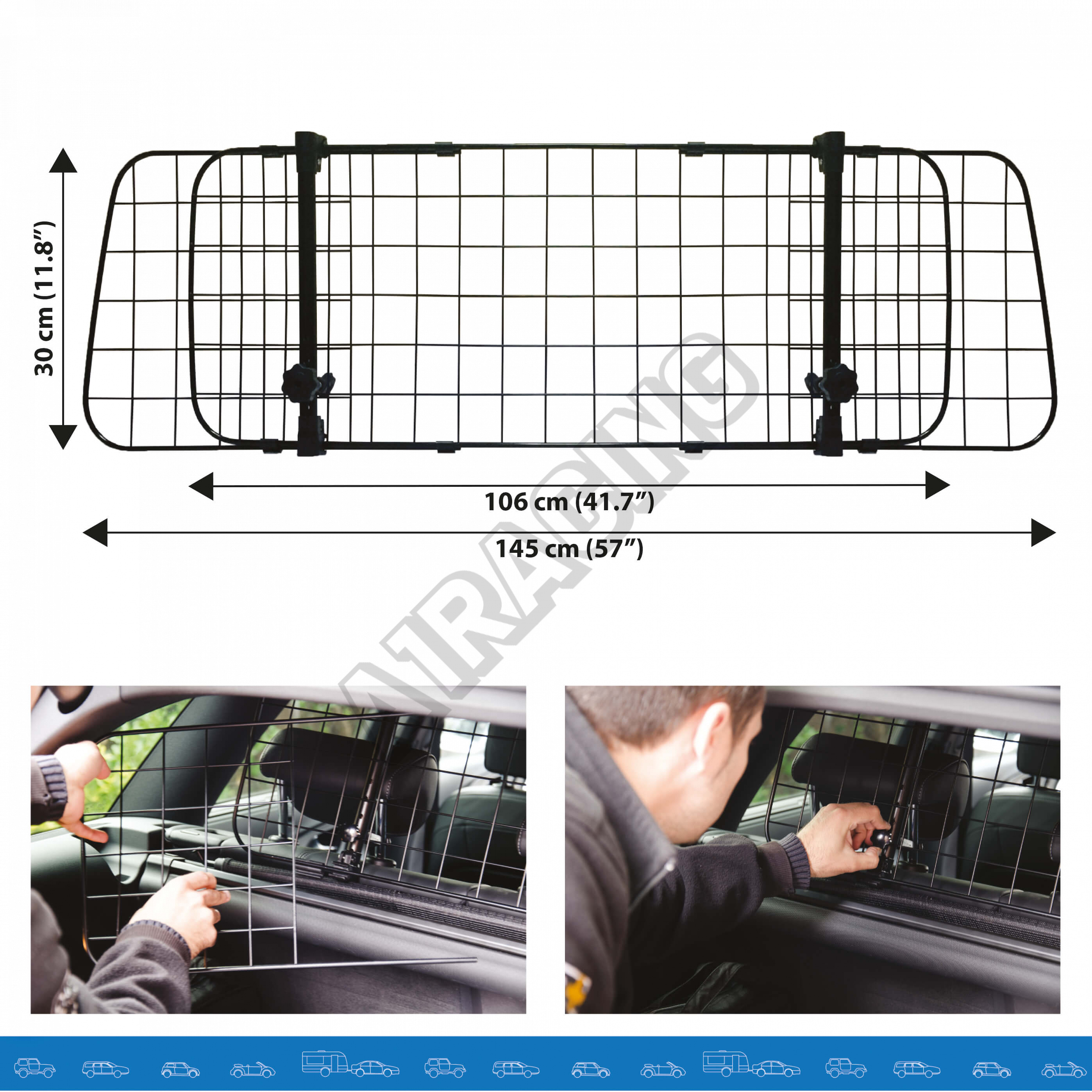 Robustní polohovatelná kovová mříž, která je určená pro časté převážení vašeho mazlíčka, která po instalaci se většinou nesundává. Bezpečně udrží vašeho domácího mazlíčka v bezpečí zavazadlového prostoru. Uchycení se provádí pomocí příslušenství zobrazené na fotce mezi sedačkou a střechou auta. Je vhodná pro většinu vozidel. BoČní mřížovanou ochranu lze nastavit pomocí šroubů od sebe podle velikosti vozidla. Výška:30 CM. Šířka: min 106 cm max. 146cm. Vyrobeno ze silných a odolných materiálů. Tato mříž je vhodná pro všechny psy až do 30 kg. Snadno se instaluje a odstraňuje během několika minut.