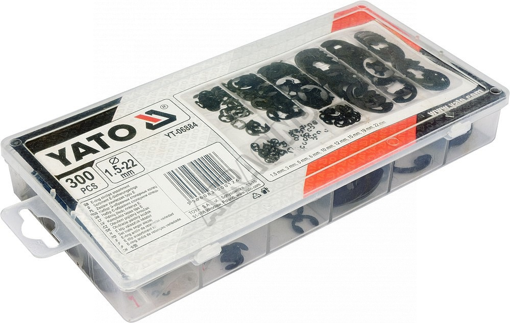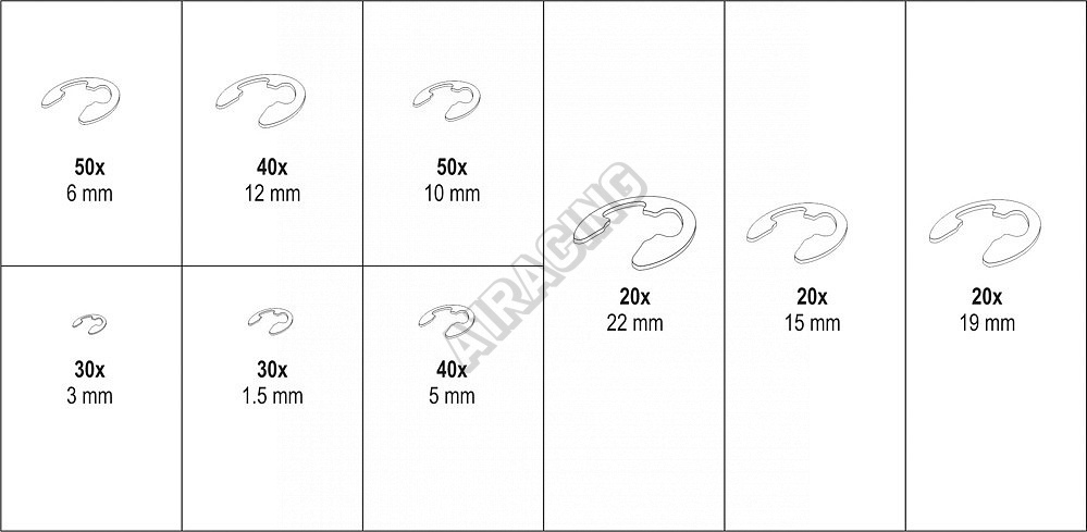 Sada 300 ks pojistných kroužků otevřených. Vše je přehledně uspořádáno v kompaktním plastovém kufřík