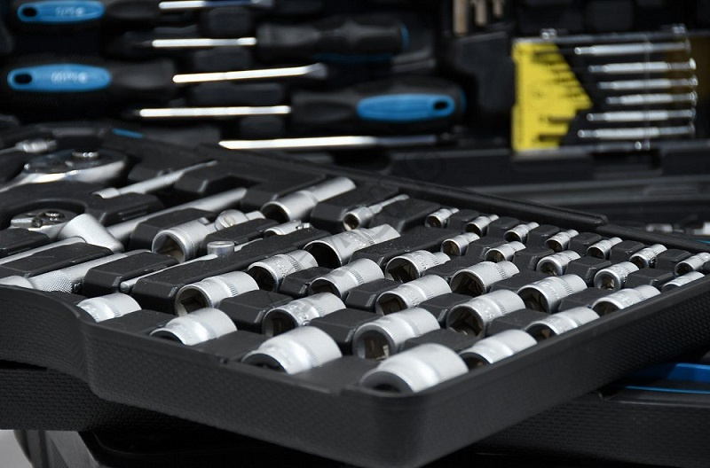 Profesionální přenosný kufr vybavený kvalitním nářadím, včetně ráčnových klíčů s velmi jemným mechanizmem a spojovacím materiálem, přehledně uspořádaným v předem určených pozicích.