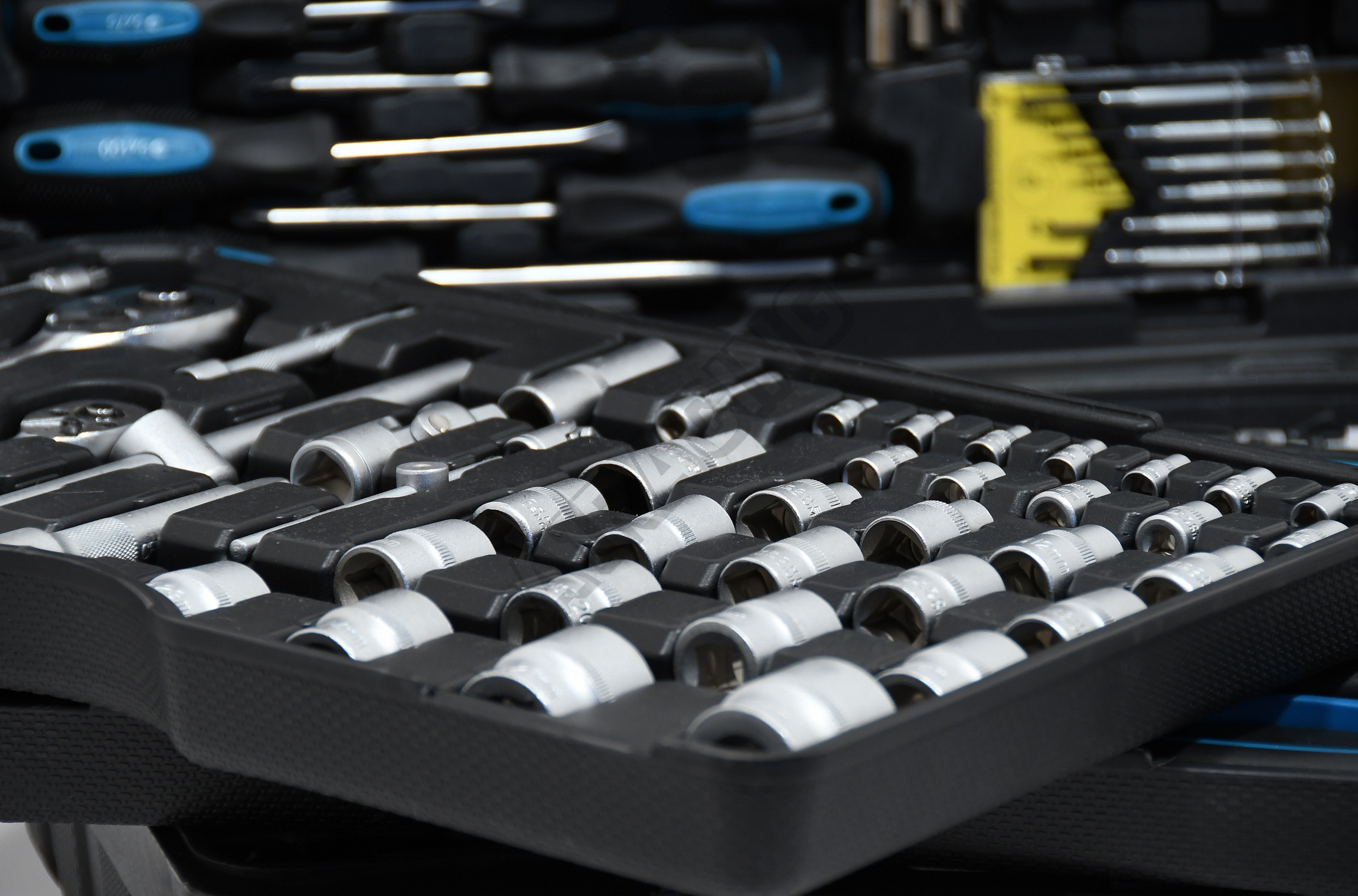 Víko obsahuje izolované, klasické a hodinářské šroubováky, spolu s imbusovými klíči, bity atd. Dále pak vysoce kvalitní ráčny, nástavce, ohebný nástavec, t-vratidla a rúzné prodlužovací nástavce z Chrom-Vanadiové oceli, umístěné ve vloženém platu.