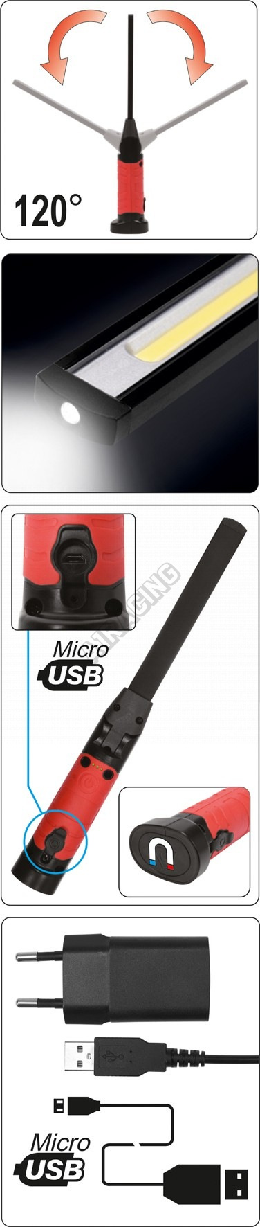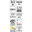 Univerzální montážní lampa vybavená 5 a 3W COB LED. K napájení slouží 3,7V akumulátor s kapacitou 26
