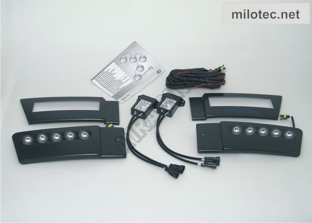 1x pár LED denních světel Hella zabudovaných v krycích plastech z černého ABS/ASA