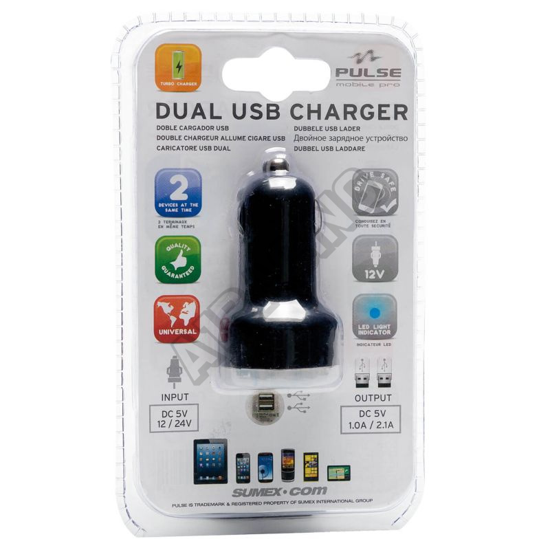 Kvalitní nabíječka firmy Pulse se dvěma vstupy pro USB ve dvou provedeních černá, a bílá s led modrým podsvícením. Díky tomuto produktu můžete nabíjet vaše elektronická zařízení v autě, jako jsou smarthpony a tablety. Vstup je 12-24V + 2 dva výstupy od 1,01 do 2,1 A. Toto zařízení má evropskou homologaci a splňuje tak přísné evropské normy.