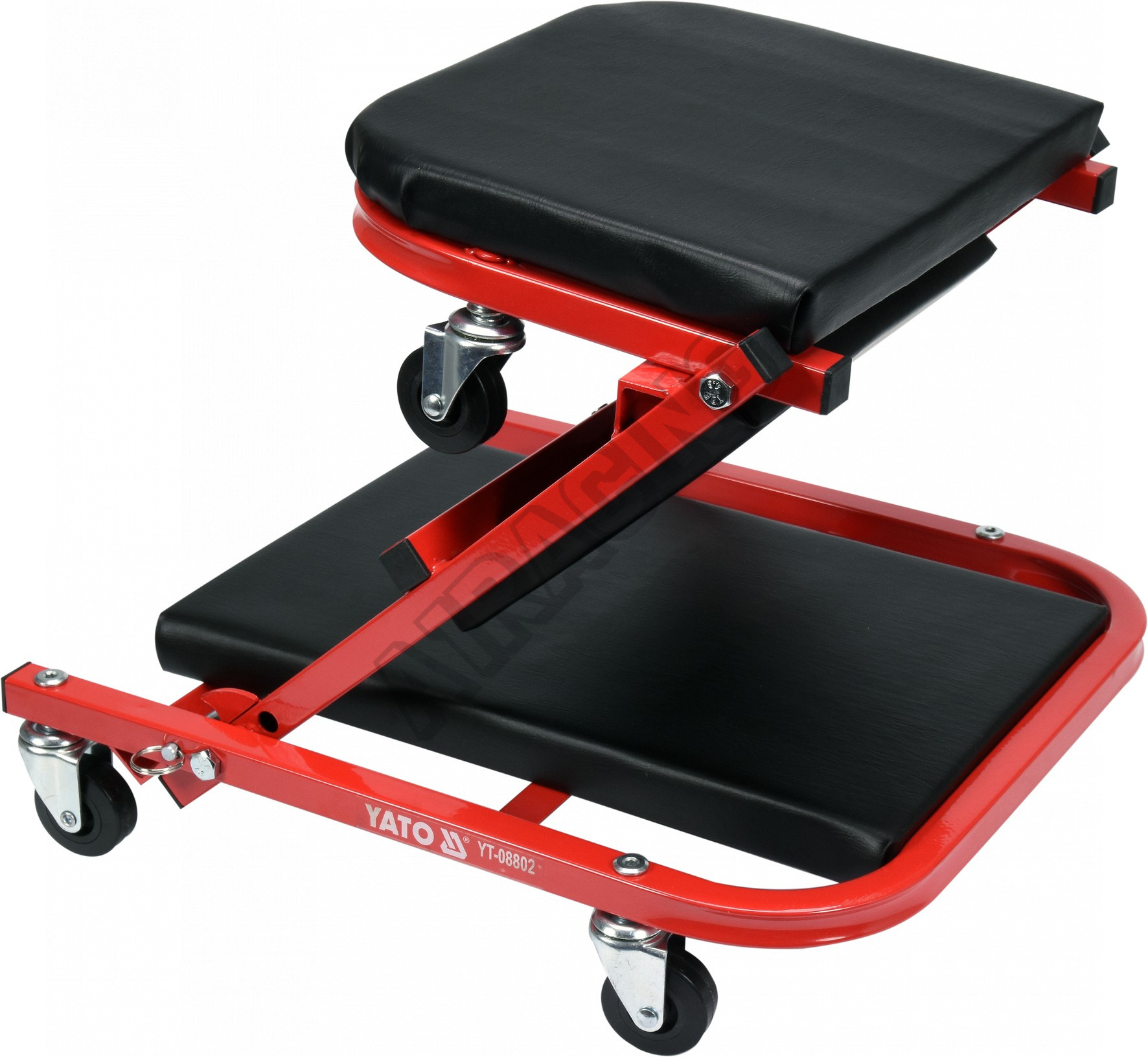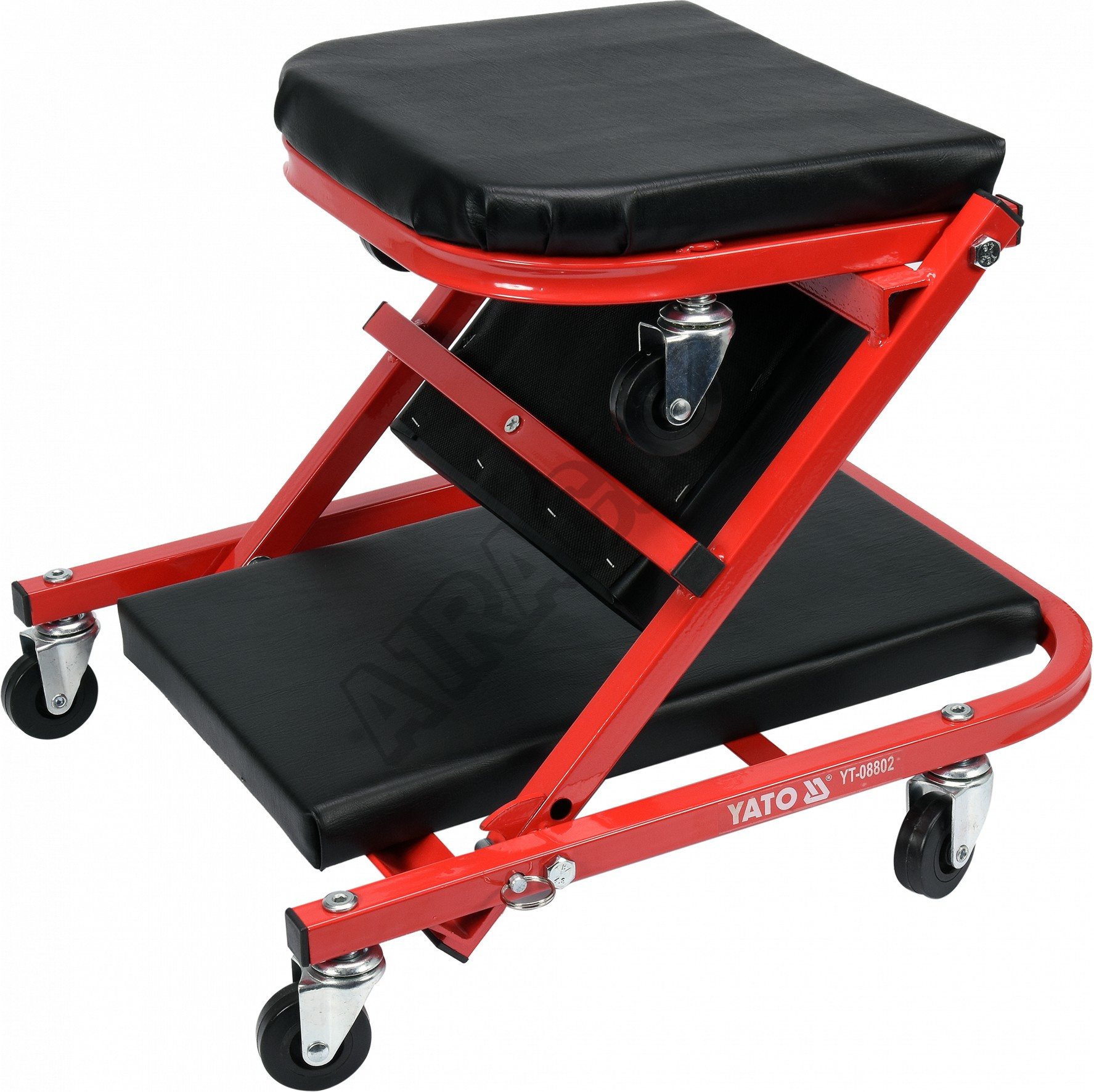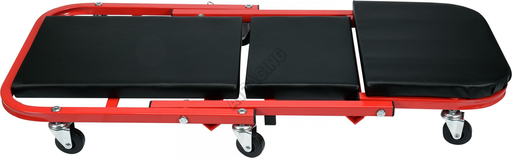 Dílenské lehátko s možností složení do podoby křesílka. Rám je vyroben z bytelného kovu a sedák je v