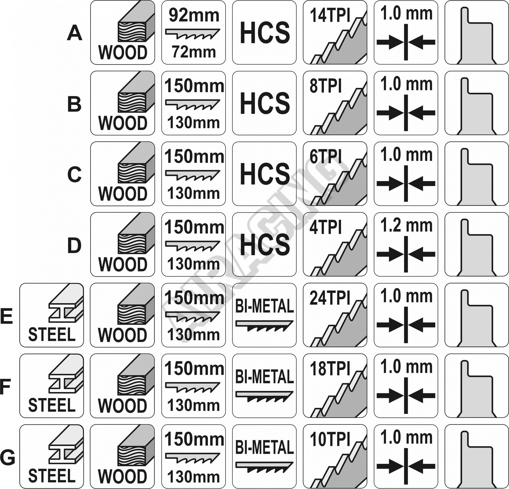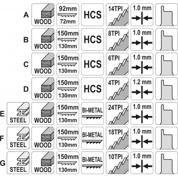- různé velikosti řezných zubů umožňují optimální výběr listu podle materiálu a požadavků