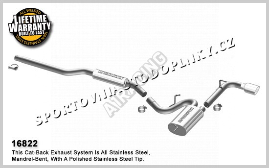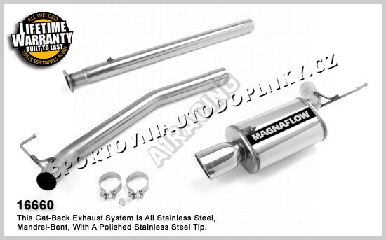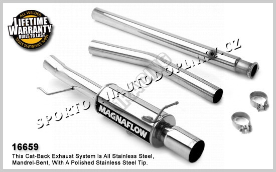 Sportovní výfukové systémy kultovní americké firmy Magnaflow patří spolu s Borlou mezi absolutní špičku ve výrobě sportovních výfuků hlavně v USA. Sportovní konstrukce v nerez provedení s leštěnými koncovkami je přesně stavěna pro daný model auta pro maximální možné navýšení výkonu. Přední úpravci často volí tuto značku jako záruku vysoké kvality, funkčnosti i nádherného zvuku. Naše firma je přímo autorizovaným prodejcem těchto výfuků pro ČRa proto vám můžeme poskytnout plnou záruku a maximální pomoc při výběru správného výfuku, Některé výfuky držíme přímo skladem a je možné je vidět na naší prodejně v Ostravě. Pokud daný výfuk je skladem v Evropě, u nás jej máme do 10 dnů, pokud je výfuk jen v USA, doba dodání kontejnerem je 2-3 měsíce, letecky 10-14 dnů s přirážkou od 6000,- Kč bez DPH podle velikosti a váhy výfuku. Nahoře vedle hlavní fotky najdete v souborech často montážní listy, fotky i videa daného modelu auta.