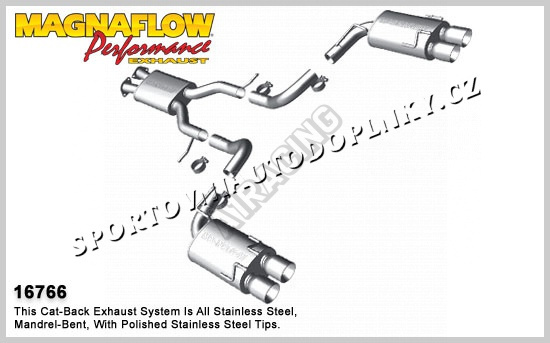 Sportovní výfukové systémy kultovní americké firmy Magnaflow patří spolu s Borlou mezi absolutní špičku ve výrobě sportovních výfuků hlavně v USA. Sportovní konstrukce v nerez provedení s leštěnými koncovkami je přesně stavěna pro daný model auta pro maximální možné navýšení výkonu. Přední úpravci často volí tuto značku jako záruku vysoké kvality, funkčnosti i nádherného zvuku. Naše firma je přímo autorizovaným prodejcem těchto výfuků pro ČRa proto vám můžeme poskytnout plnou záruku a maximální pomoc při výběru správného výfuku, Některé výfuky držíme přímo skladem a je možné je vidět na naší prodejně v Ostravě. Pokud daný výfuk je skladem v Evropě, u nás jej máme do 10 dnů, pokud je výfuk jen v USA, doba dodání kontejnerem je 2-3 měsíce, letecky 10-14 dnů s přirážkou od 6000,- Kč bez DPH podle velikosti a váhy výfuku. Nahoře vedle hlavní fotky najdete v souborech často montážní listy, fotky i videa daného modelu auta.