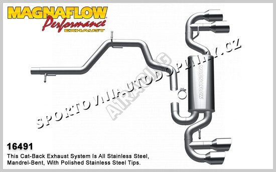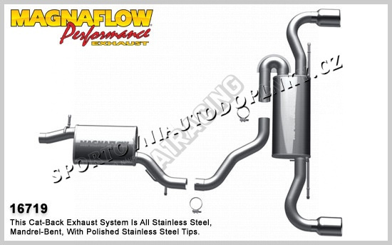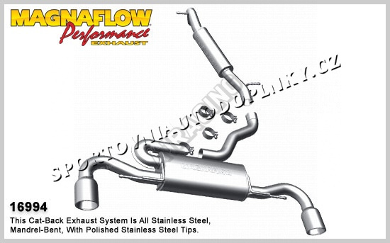 Sportovní výfukové systémy kultovní americké firmy Magnaflow patří spolu s Borlou mezi absolutní špičku ve výrobě sportovních výfuků hlavně v USA. Sportovní konstrukce v nerez provedení s leštěnými koncovkami je přesně stavěna pro daný model auta pro maximální možné navýšení výkonu. Přední úpravci často volí tuto značku jako záruku vysoké kvality, funkčnosti i nádherného zvuku. Naše firma je přímo autorizovaným prodejcem těchto výfuků pro ČR a proto vám můžeme poskytnout plnou záruku a maximální pomoc při výběru správného výfuku, Některé výfuky držíme přímo skladem a je možné je vidět na naší prodejně v Ostravě. Pokud daný výfuk je skladem v Evropě, u nás jej máme do 10 dnů, pokud je výfuk jen v USA, doba dodání kontejnerem je 2-3 měsíce, letecky 10-14 dnů s přirážkou od 6000,- Kč bez DPH podle velikosti a váhy výfuku. Nahoře vedle hlavní fotky najdete v souborech často montážní listy, fotky i videa daného modelu auta.