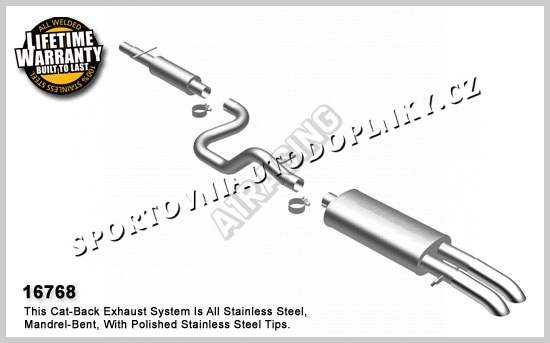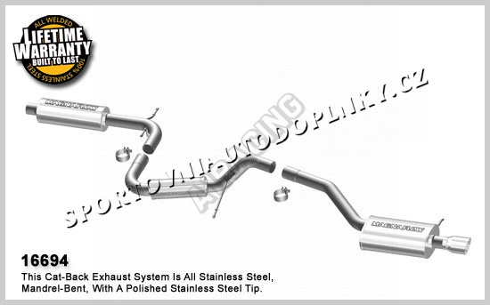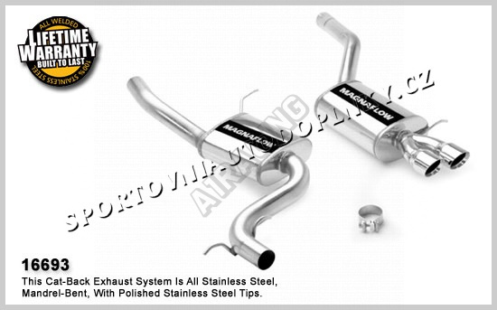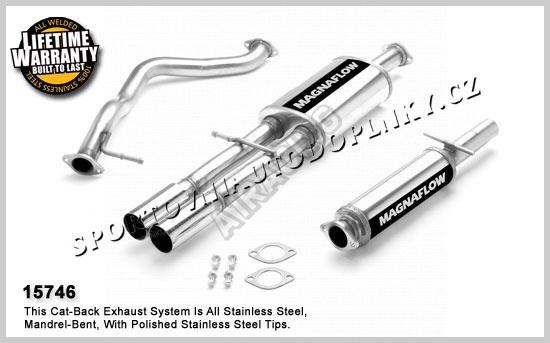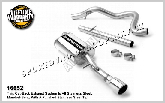 Sportovní výfukové systémy kultovní americké firmy Magnaflow patří spolu s Borlou mezi absolutní špičku ve výrobě sportovních výfuků hlavně v USA. Sportovní konstrukce v nerez provedení s leštěnými koncovkami je přesně stavěna pro daný model auta pro maximální možné navýšení výkonu. Přední úpravci často volí tuto značku jako záruku vysoké kvality, funkčnosti i nádherného zvuku. Naše firma je přímo autorizovaným prodejcem těchto výfuků pro ČR a proto vám můžeme poskytnout plnou záruku a maximální pomoc při výběru správného výfuku, Některé výfuky držíme přímo skladem a je možné je vidět na naší prodejně v Ostravě. Pokud daný výfuk je skladem v Evropě, u nás jej máme do 10 dnů, pokud je výfuk jen v USA, doba dodání kontejnerem je 2-3 měsíce, letecky 10-14 dnů s přirážkou od 6000,- Kč bez DPH podle velikosti a váhy výfuku. Nahoře vedle hlavní fotky najdete v souborech často montážní listy, fotky i videa daného modelu auta.