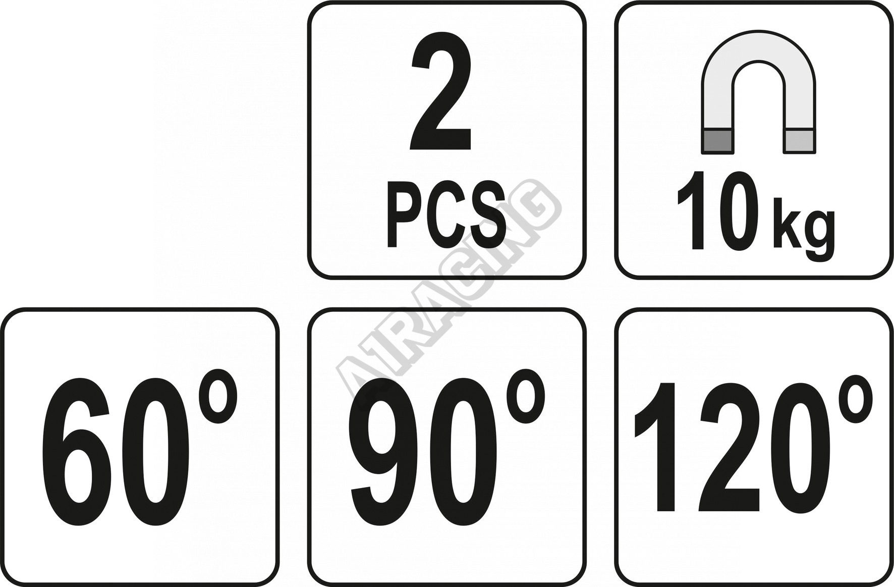 Sada 2 magnetických úhelníků používaných pro svařování a montáž různých prvků, např. plechů, upevňovacích prvků, plochých tyčí, profilů, trubek atd.