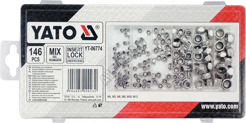 Sada 146 ks kvalitních pojistných matic s nylonem. Vše je přehledně uspořádáno v kompaktním plastové