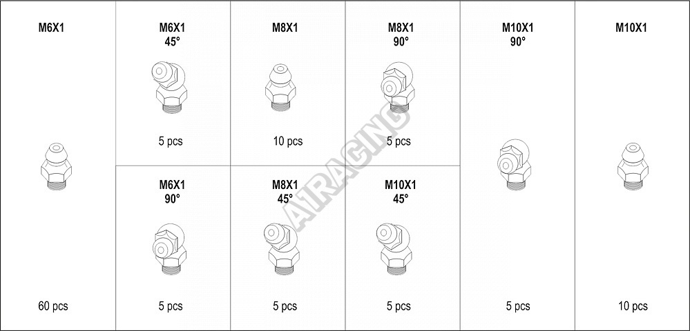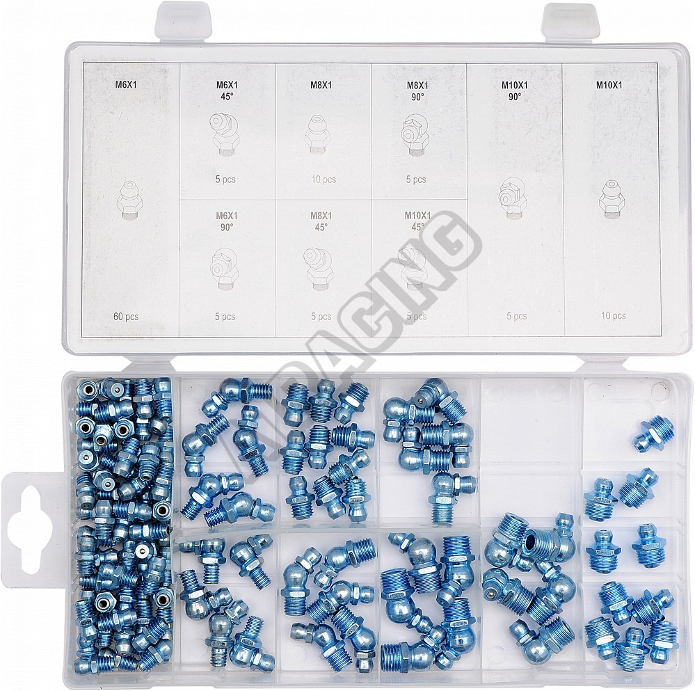 Sada obsahuje 110 kusů mazacích hlavic s metrickým závitem, nepostradatelných v garáži, zemědělství nebo průmyslu.