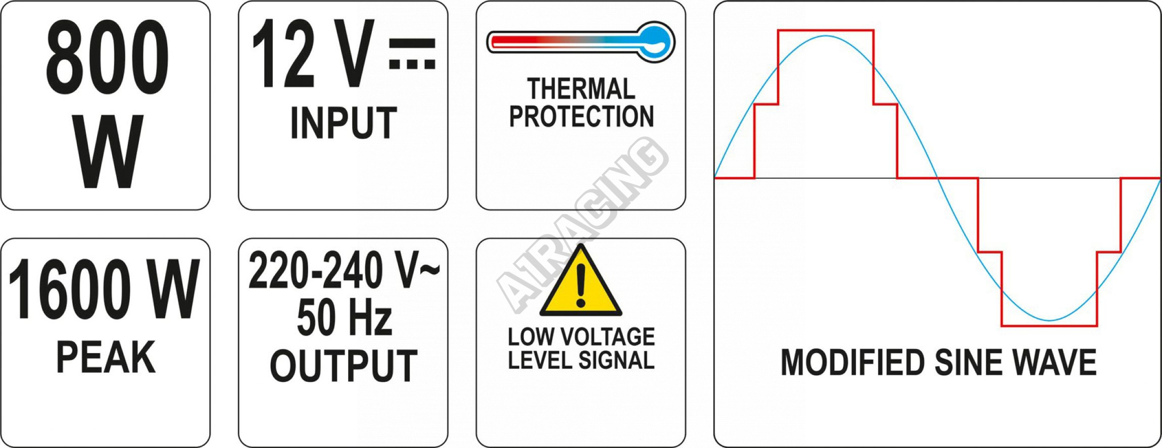 | Výstup | 230V~ 50Hz (obdélníkový průběh, modifikovaná sinusoida) |