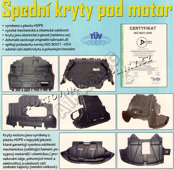 - kryty motoru jsou vyrobeny z kvalitního HDPE plastu, garantují vysokou mechanickou odolnost včetně neprosakování benzínu, oleje nebo elekrolytu z baterie, plně nahradí originální díl, který je často i několkanásobně dražší, tyto kryty splňují ISO 9001 a mají německý certifikát TUV