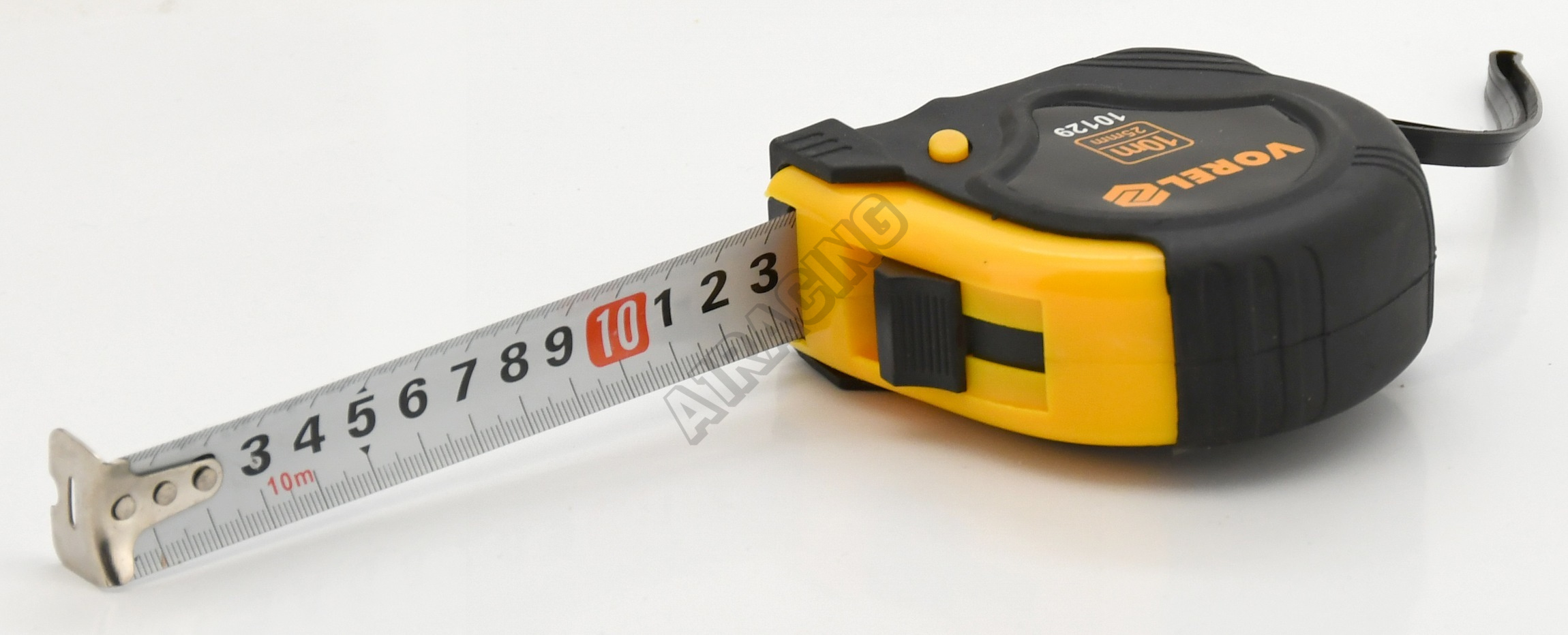 Svinovací metr 10 m dlouhý a 25 mm široký zakončený pohyblivým háčkem. Pouzdro je vyrobeno z plastu, vyztuženo gumovými podložkami a aretačním knoflíkem.